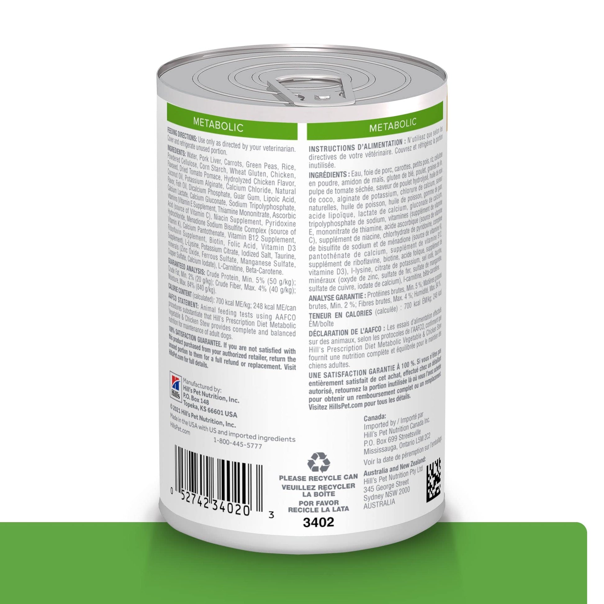 - Hill's Prescription Diet Metabolic Weight Management Vegetable & Chicken Stew Canned Dog Food clinical nutrition helps dogs lose weight and keep the lost weight off naturally by activating their unique metabolism