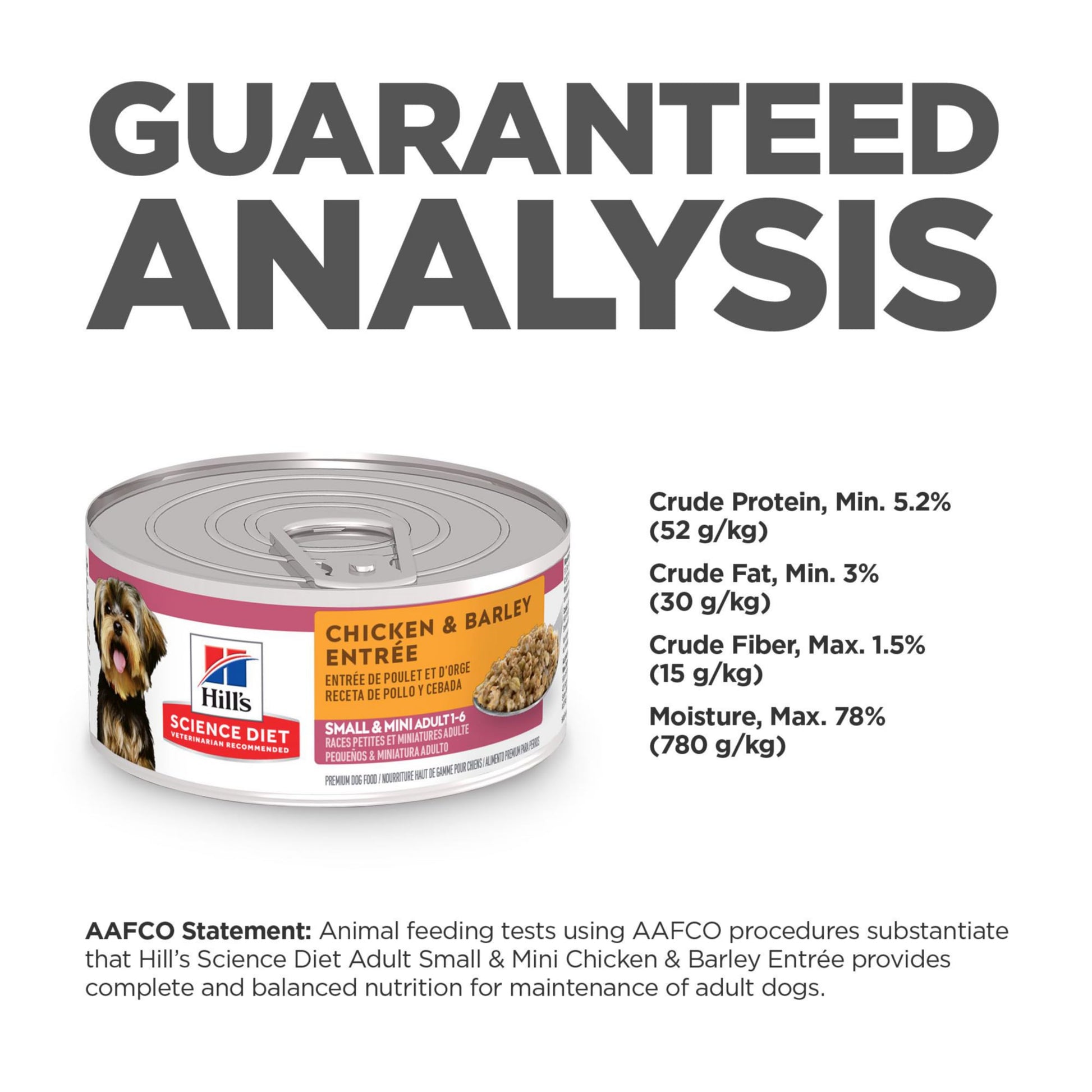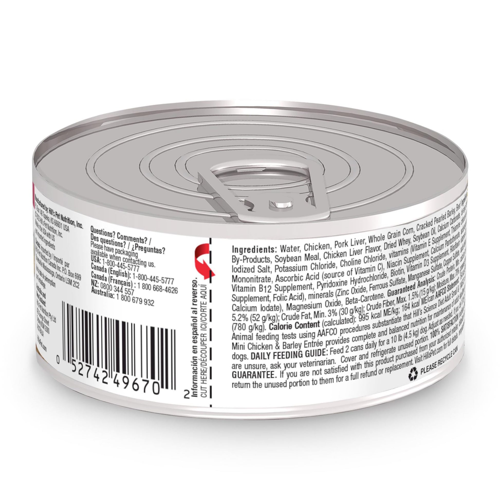 Even little dogs have big appetites, and your small-breed dog is no exception. Hill's Science Diet Adult Small & Mini Chicken & Barley Entrée dog food is tailored nutrition for the unique needs of small & mini dogs during the prime of their life. Packed with quality protein to maintain lean muscle, this canned dog food made with natural ingredients contains an antioxidant blend specially formulated for your little dog.