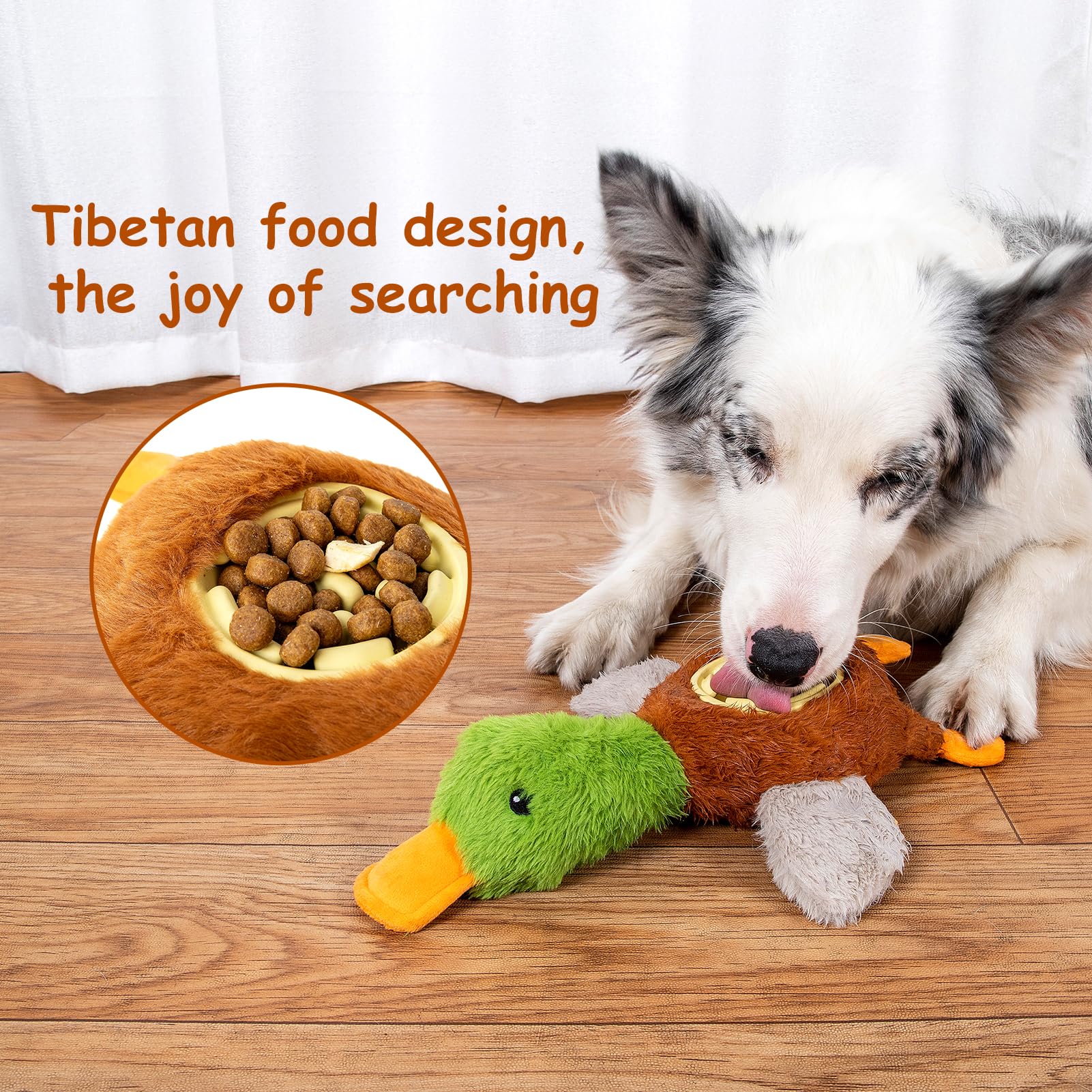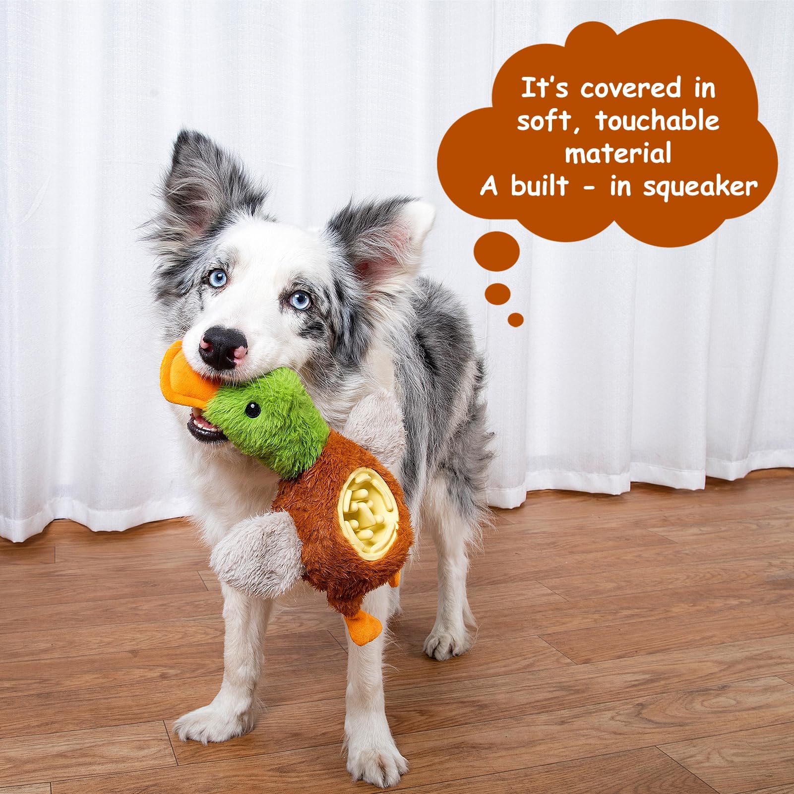 Plush Dog Toy - This squeaky pet toy is a delightful creation in a cartoon wild duck. It's made of soft short plush fabric. The natural rubber slow feeder bowl built-in abdomen is no harmful substance,ensures a worry-free playtime.