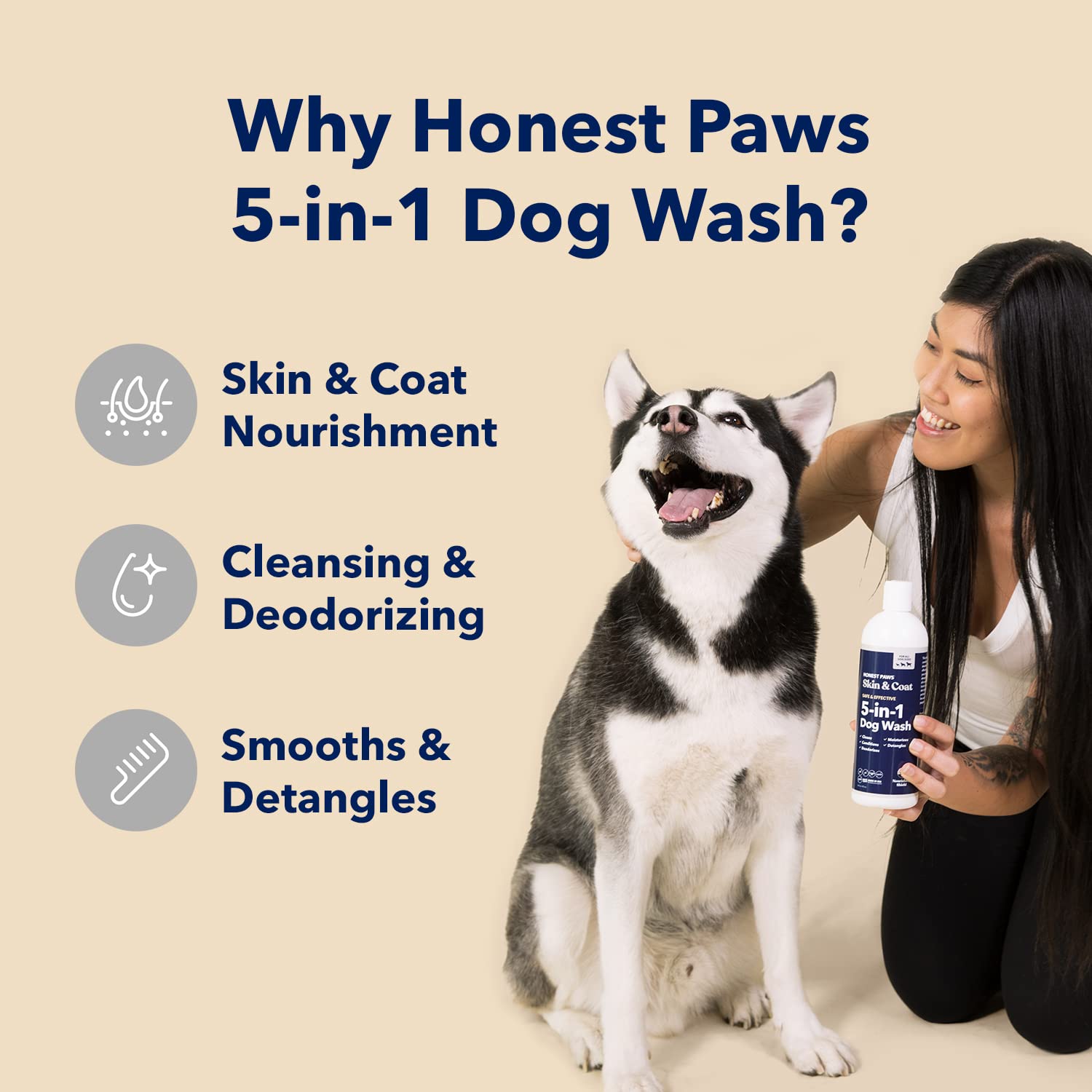 - Five benefits in one wash: Cleans, deodorizes, conditions, detangles coat, and moisturizes skin-- Honest Paws Skin and Coat 5-in-1 Dog Wash is a one-step and easy-to-use premium dog wash. It is all you need to keep your dog's fur and skin soft, moisturized, and clean