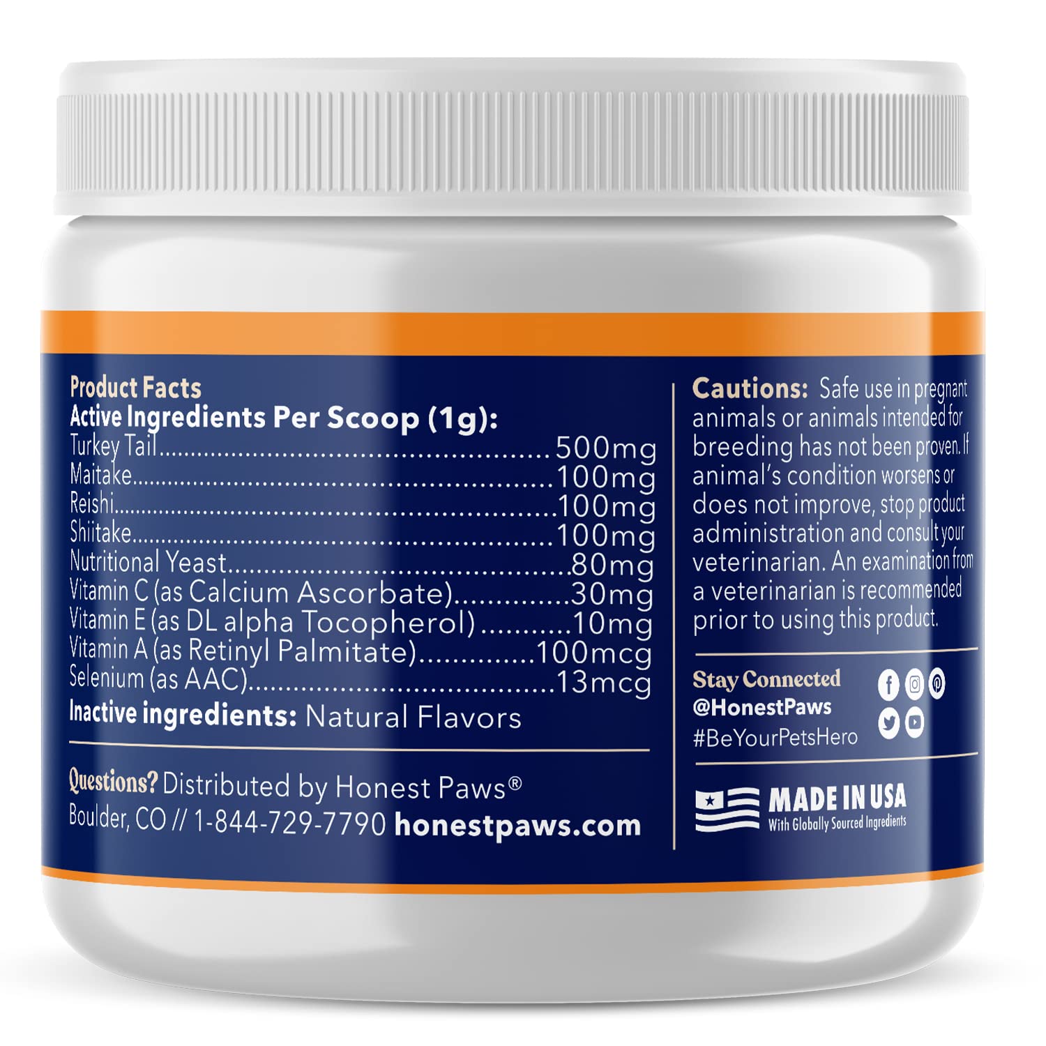 - Boosts immune support: Honest Paws turkey tail mushroom complex fights free radicals and helps with inflammation, contributing to your dog's overall well-being and long, healthy life