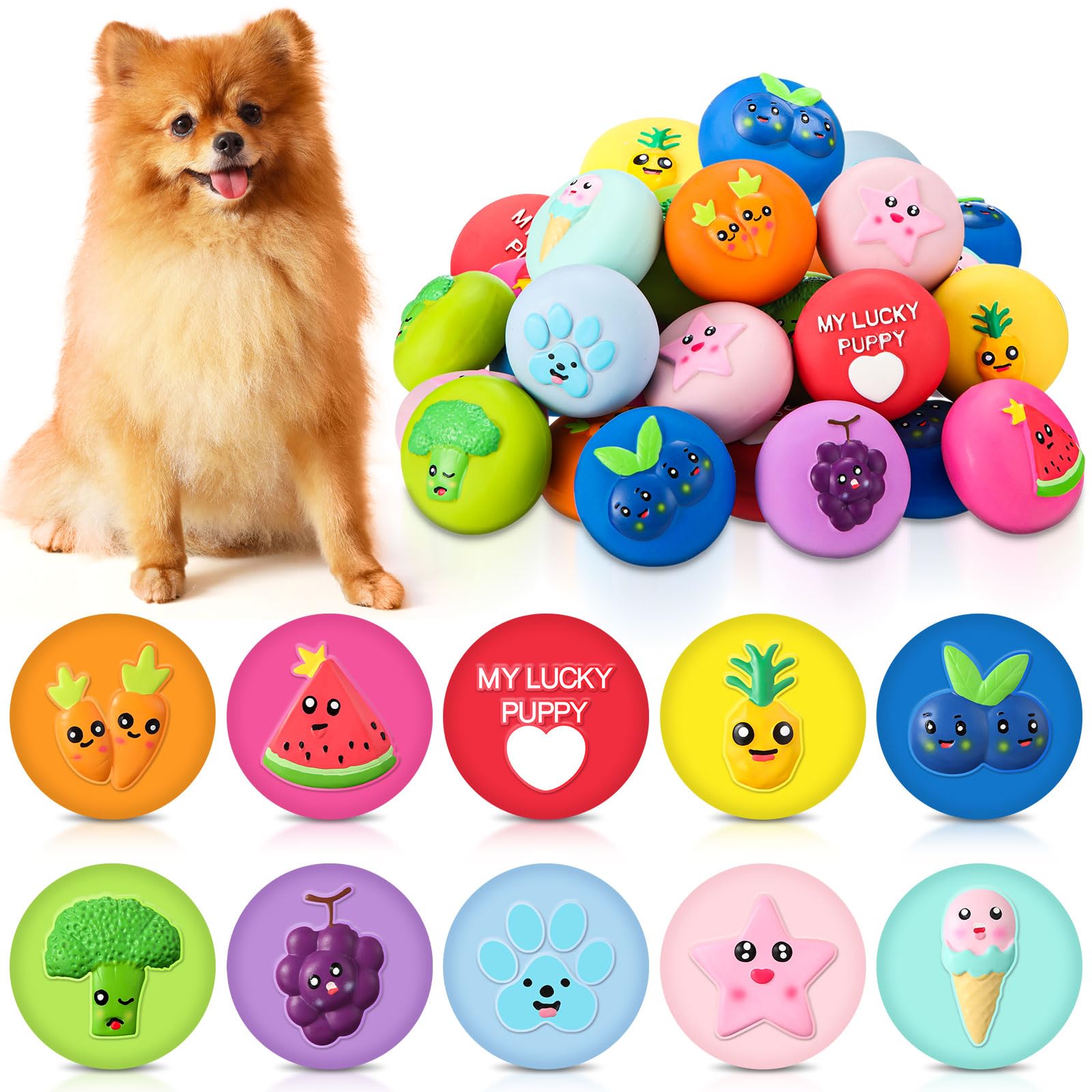 Hungdao 40 Pcs Bulk Dog Squeaky Toys Soft Rubber Latex Dog Toys Small Squeaky Balls Interactive Fetch Balls for Teething Small Pet Breeds Training(Cute Fruit)