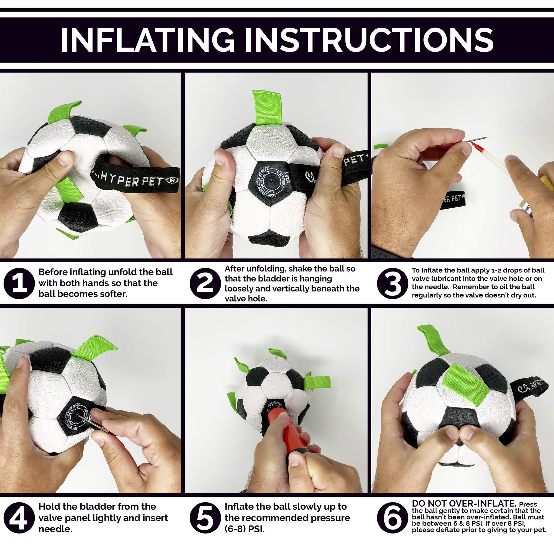 • UNIQUE DURABLE NYLON TABS: Durable nylon tabs are sewn into the seams of our dog soccer ball to give your pet a new way to pull, toss and tug the lightweight dog toy. Our dog ball also has a handle so you can play too. Our dog toy ball comes deflated with needle included. PUMP NOT INCLUDED.