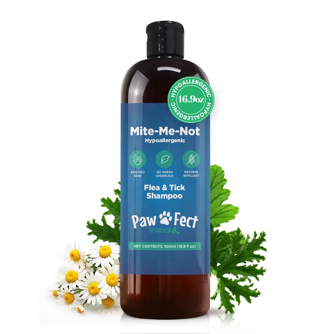 Hypoallergenic Flea and Tick Relief 16.9oz Dog Shampoo for Sensitive Skin Mite Me Not Formula for Itchy and Dry Coats Deep Cleansing and Moisturizing Pet Wash for Dogs and Puppies 500ml