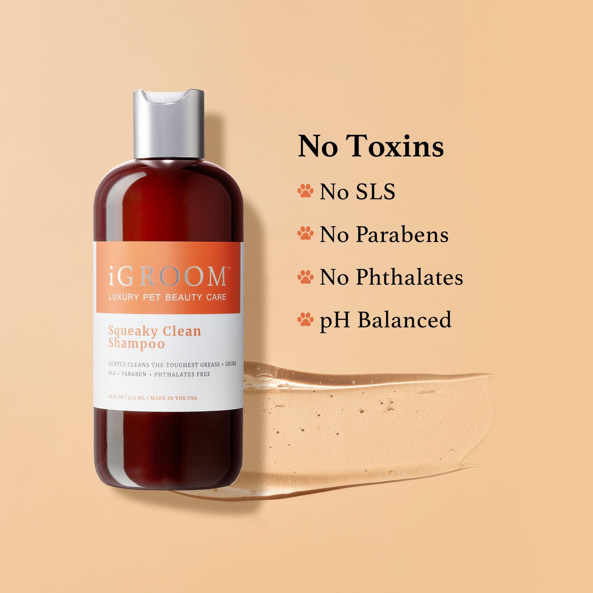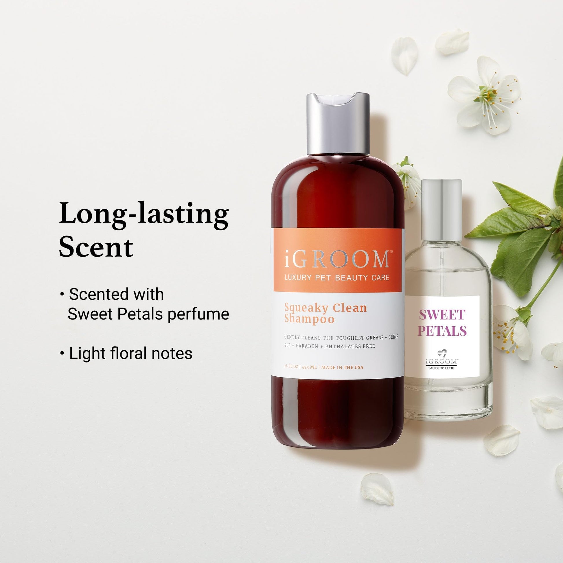 • DEEP CLEANING DOG SHAMPOO – a heavy-duty pet shampoo to gently break up the heaviest of greasy build-ups. Easily removes dirt, grease, and grime. Squeaky Clean rinses out effortlessly and leaves the coat soft, luxurious, and smelling beautiful. Ideal for all coat types. Scented with iGroom Sweet Petals perfume.