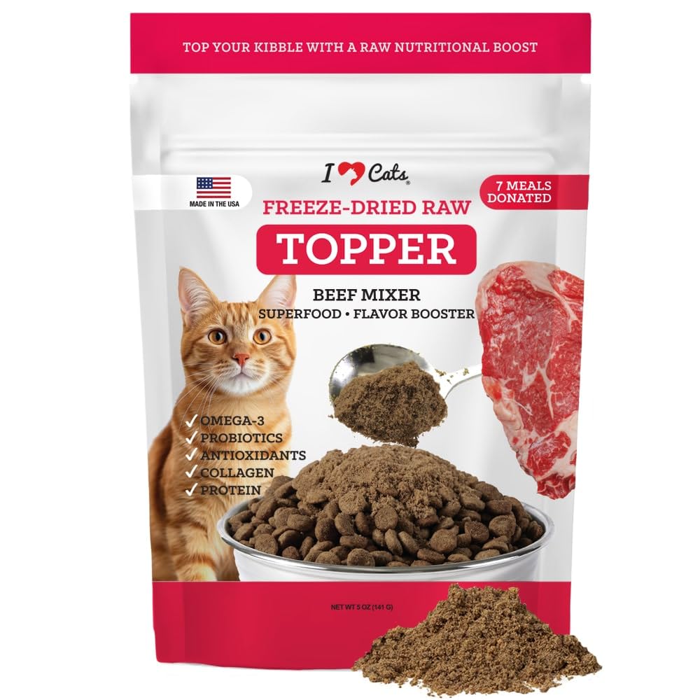 iHeartCats Nutrition Boost Beef Cat Food Topper & Seasoning - Tasty Freeze Dried Beef with Probiotics, Collagen, Salmon Oil, Blueberries & Carrots - 5 oz
