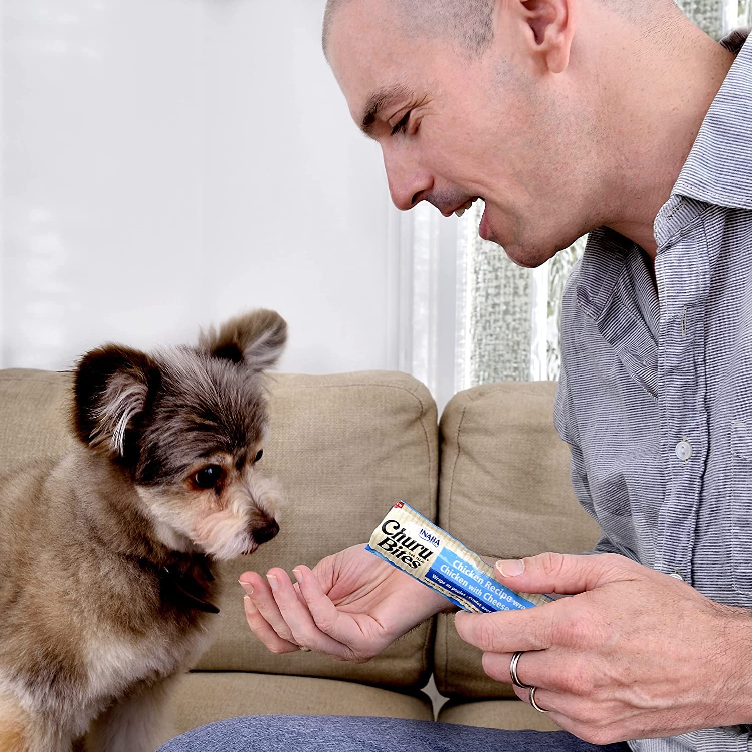 INABA Churu Bites for Dogs, Grain-Free, Soft/Chewy Baked Chicken Wrapped Churu Filled Dog Treats, 0.42 Ounces Each Tube | 24 Tubes Total, Chicken with Cheese Recipe