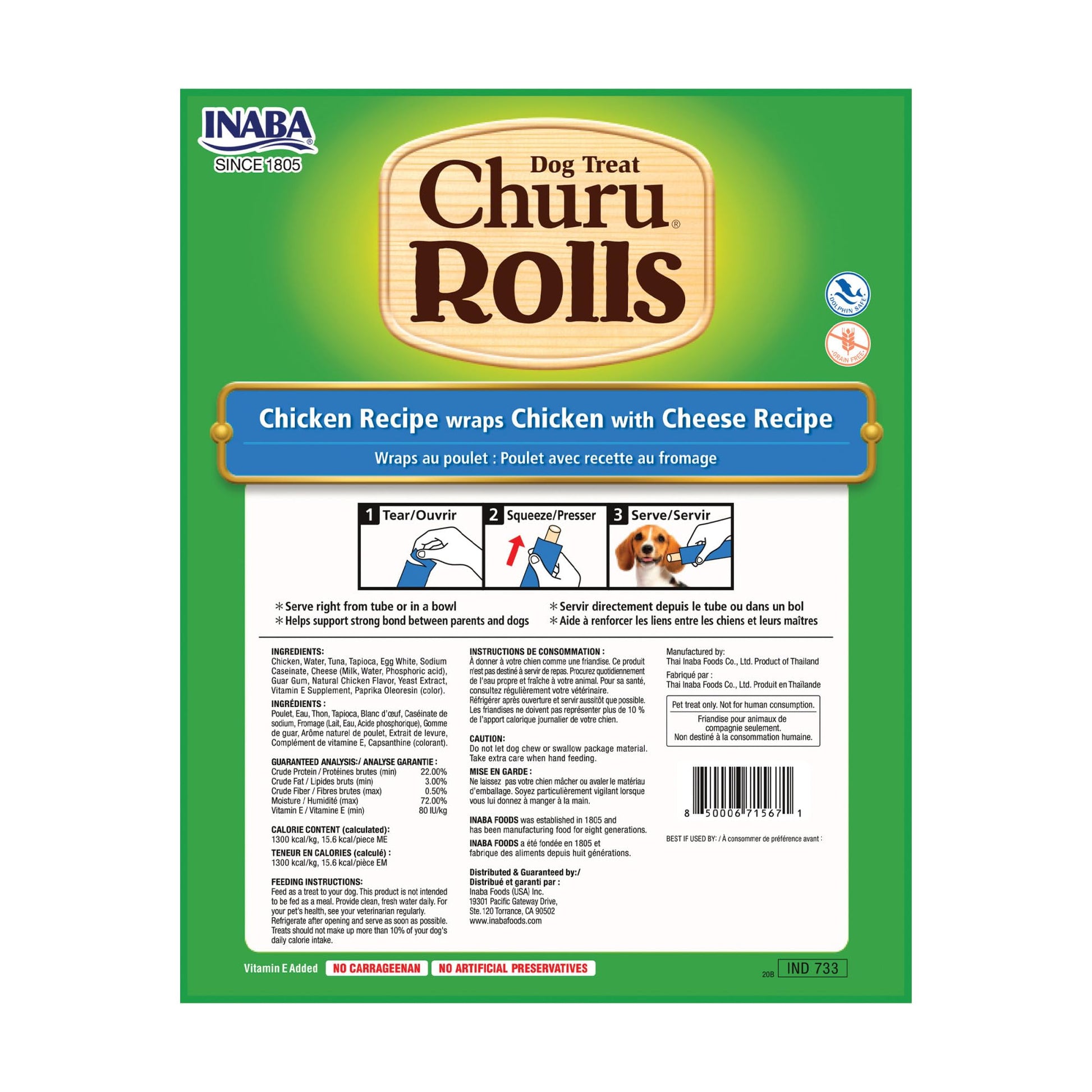 - TWICE THE TEXTURE: Each chewy roll starts with a soft baked chicken paste that is grain-free, preservative-free, and free from artificial colors. Then we've filled the center with INABA's delicious Churu purée to give your pup two delicious textures