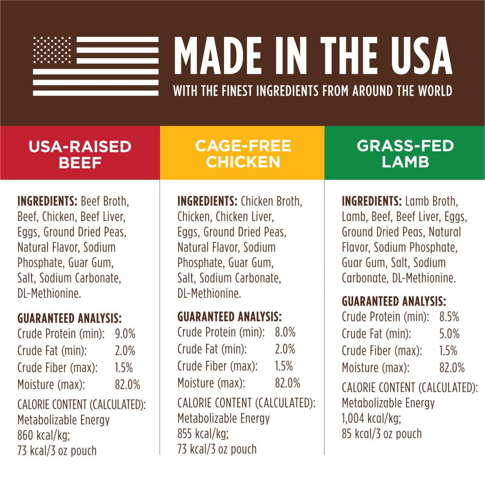 - NATURAL WET DOG FOOD TOPPERS WITH SAVORY GRAVY: Made with cuts of USA raised beef, cage free chicken or grass fed lamb in savory gravy. Made without grain, potato, corn, wheat, soy, carrageenan, artificial colors or preservatives.