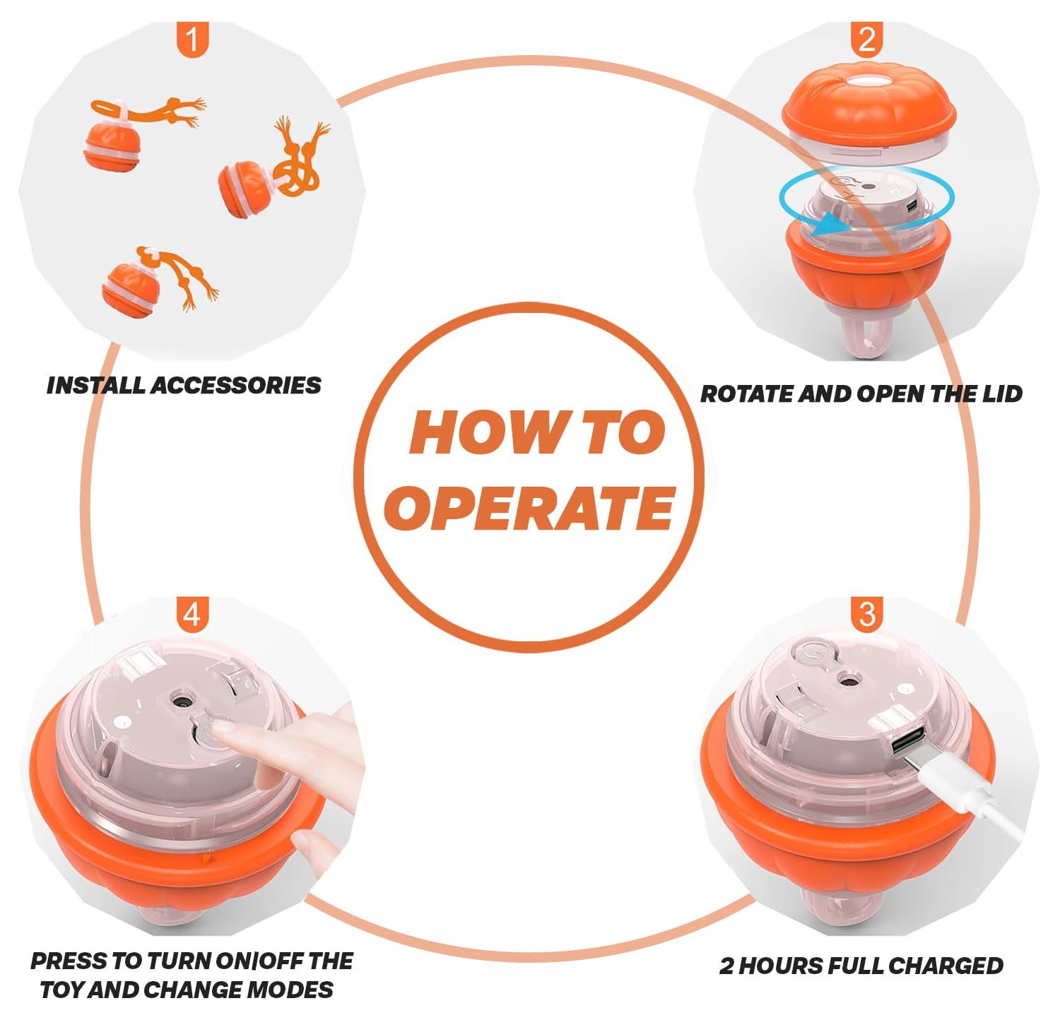 🎁 Complete Package & Perfect Gift – Includes 1 Smart Dog Ball (Choose from Orange or Blue), 2 Long Ropes, 1 Type-C USB Charging Cable, and 1 User Manual. With its adorable pumpkin-shaped design, it's a great gift for Halloween or any dog-loving owner!