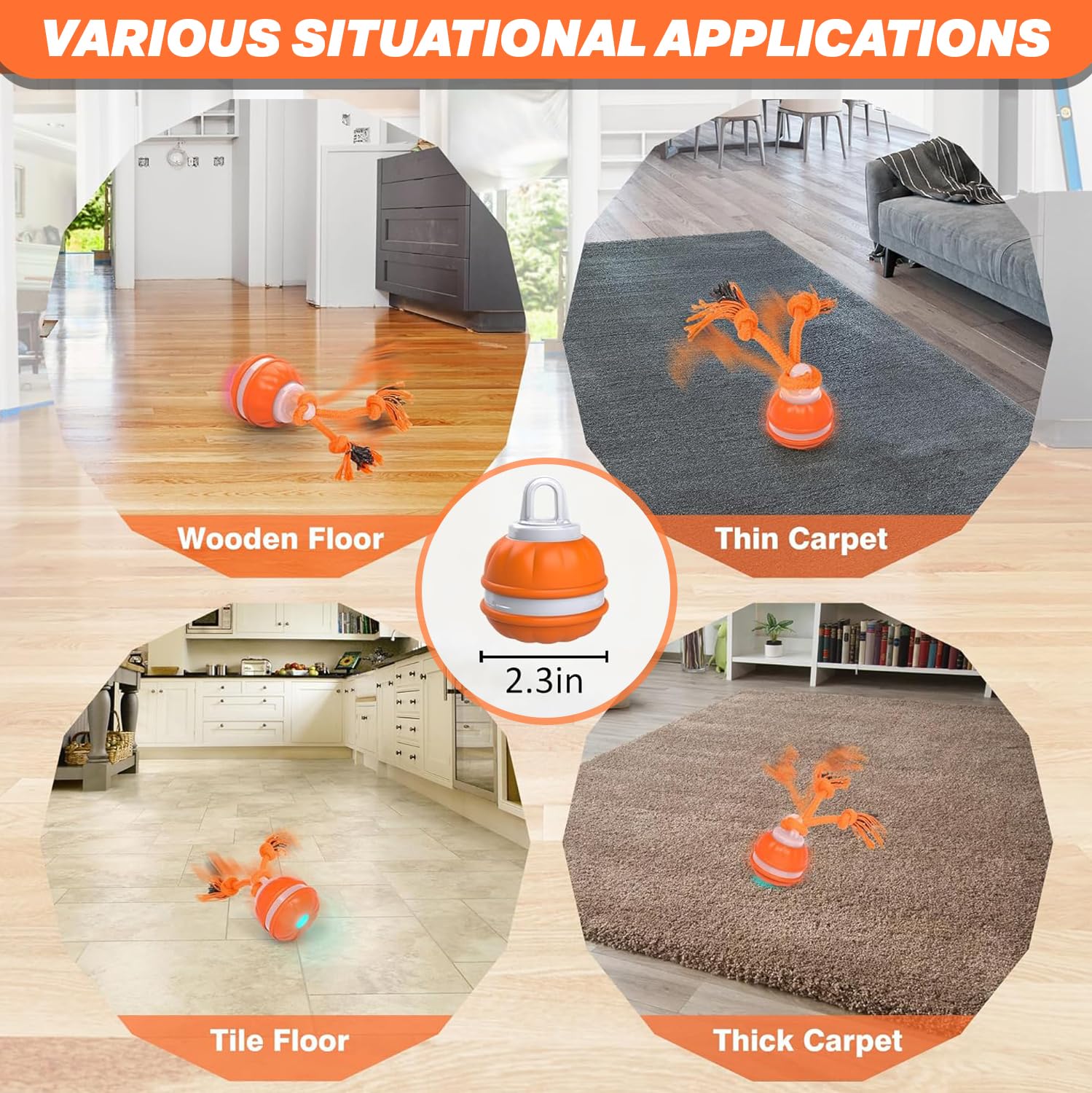 🔄 Three Play Modes for All Energy Levels – Choose from Fast Running (Blue Light), Slow Running (Purple Light), or Interactive Mode (Yellow Light) to suit your dog's playstyle. Works best on carpets, tile, wooden, and marble floors.