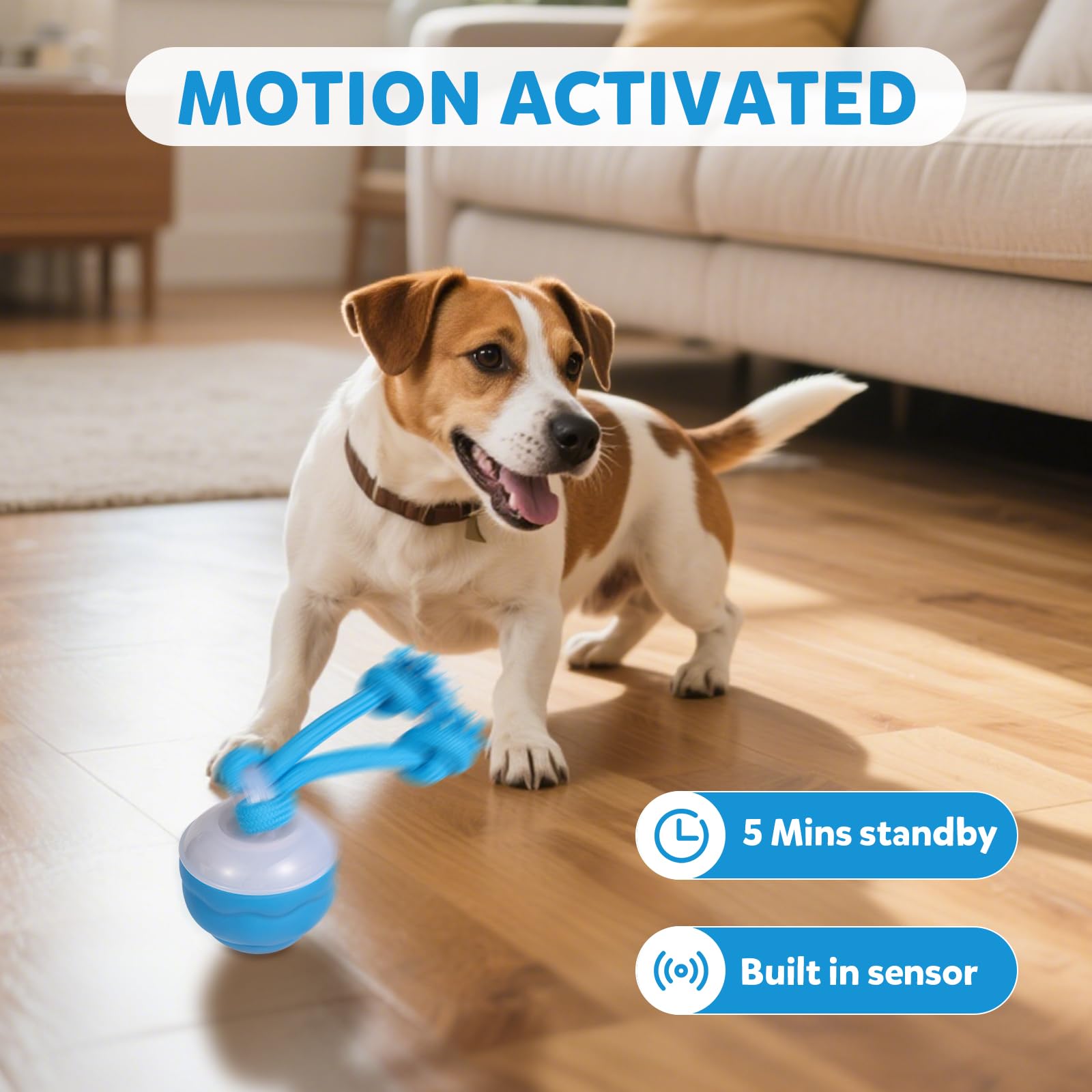• Touch-Activated Excitement: This moving dog ball runs for 5 minutes, then pauses – springing back to life when your dog nudges or bites it! An essential interactive toy for dogs to combat boredom independently, especially as small dog interactive toys.