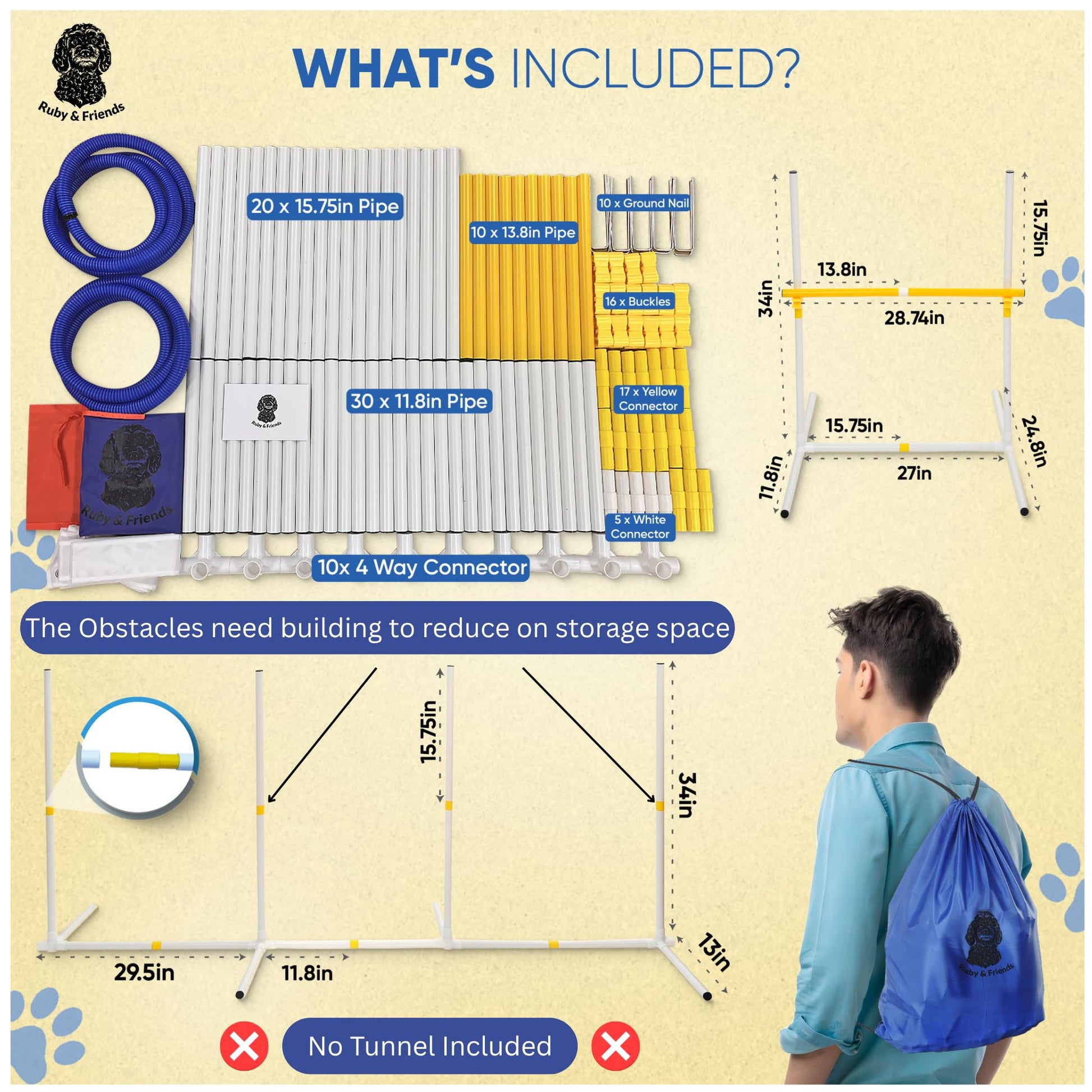 - GREAT GIFT IDEAS: This fantastic doggie agility set is a great gift idea for young and old dog lovers! It included an agility tunnel, 8 weave Poles, adjustable agility hurdle, jump rings, a square pause box, a whistle, 2 pet tennis ball toys,1 dog treat pouch and 2 carrying cases!!