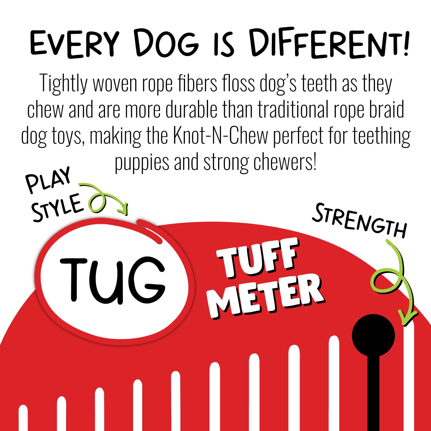 Jolly Pets' Knot-N-Chew dog toys offer a chewing challenge and tug toy all in one. Tightly woven rope fibers floss dog’s teeth as they chew and are more durable than traditional rope braid dog toys. This make the Knot-N-Chew dog toy perfect for teething puppies and strong chewers. Ideal for indoor or outdoor use, the Knot-N-Chew encourages interactive and solo play, and relieves pent up energy. Proudly offered by Jolly Pets. Jolly Pets is proud to support organizations nationwide that provide dog toys to dogs in shelters- we believe all dogs should be Jolly