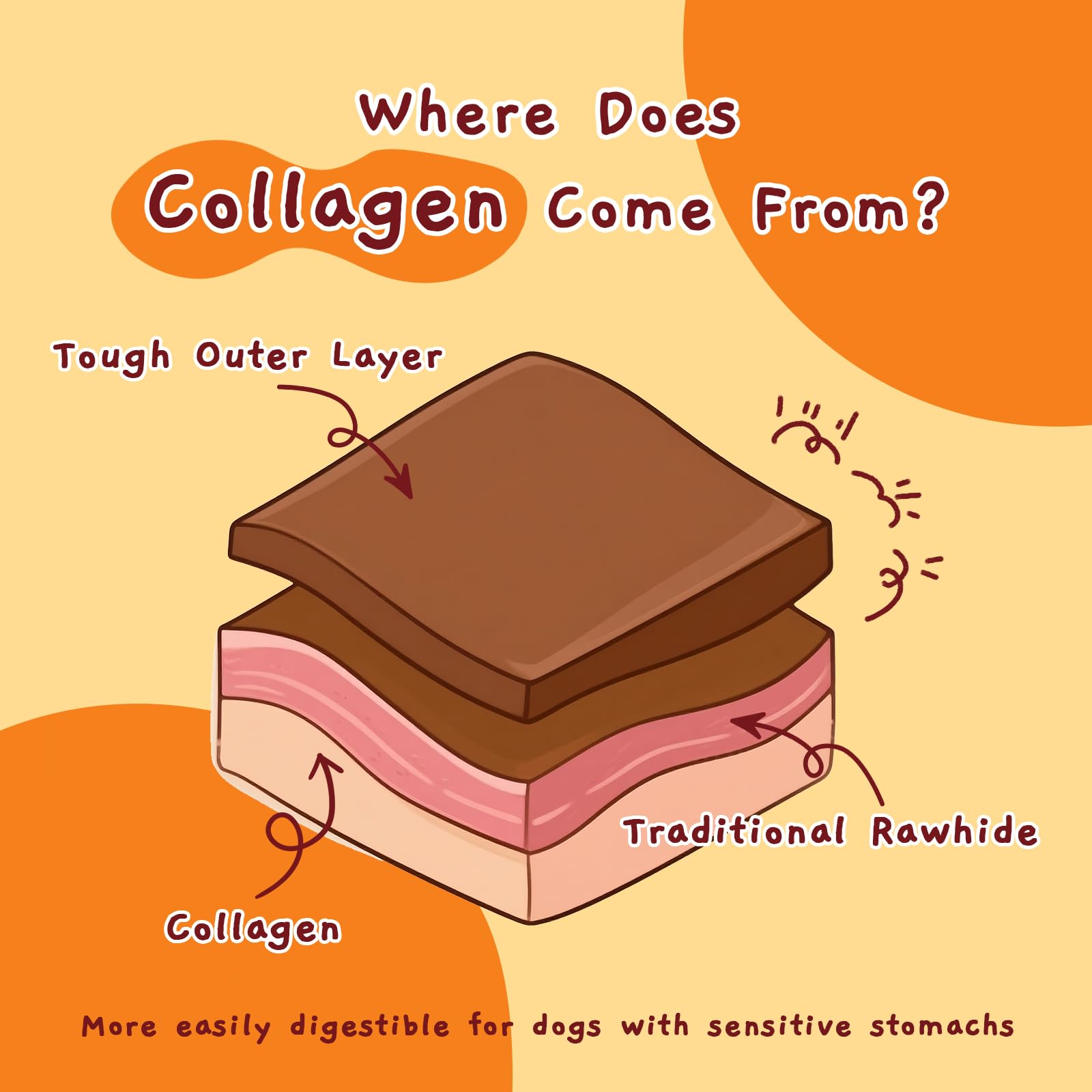 - HEALTHIER RAWHIDE ALTERNATIVE: Unlike traditional rawhide, these duck-wrapped chicken collagen sticks are easily digestible and have less smell than bully sticks. Made without artificial additives, colors, or harsh chemicals, they are gentle on sensitive stomachs. They are also slower to break down for lasting chewing enjoyment for small, medium, and large breeds