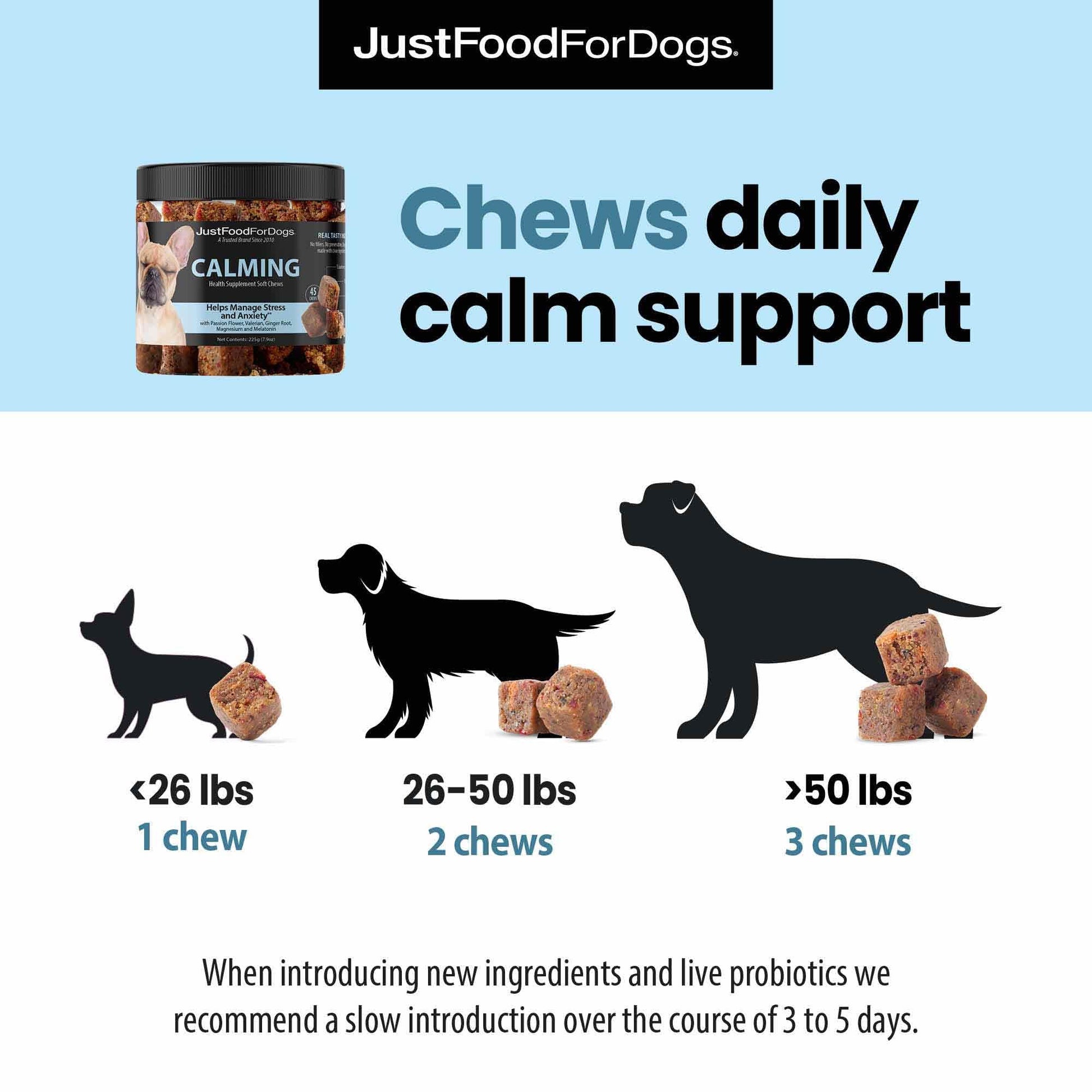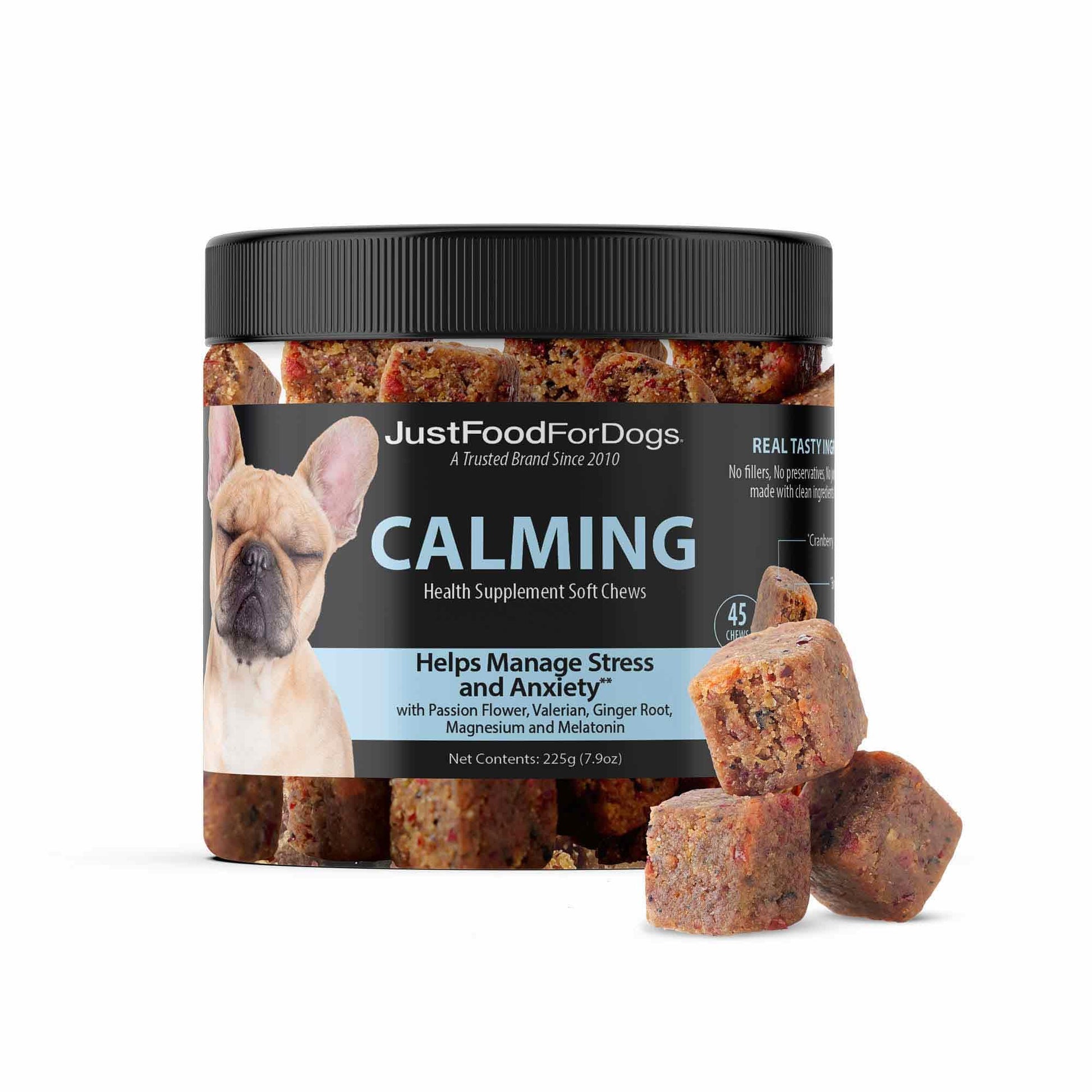 Details: JustFoodForDogs Calming Soft Chews were developed with a blend of clean ingredients packed with herbal remedies and micronutrients that work together to help your dog handle internal and external stressors. These tasty calming soft chews help dogs maintain contentment during otherwise stressful situations such as separation, moving, vet visits, travel, and tension caused by changes in their daily routine. Active ingredients include passionflower and valerian, two herbs that have been used for centuries for their calming properties. Did we mention they’re made with delicious real whole foods? There’s no lengthy ingredient list here—our soft chew dog supplements are made with real ingredients you know and recognize (and can pronounce). You won’t find mystery meat “meals”, preservatives, or cheap fillers on any of our ingredient labels. JustFoodForDogs Calming Soft Chews are made with high-quality active ingredients and delicious nutrient-rich superfoods like blueberries, broccoli, dates, and carrots. The Science: Passionflower and valerian support optimal levels of GABA (gamma-aminobutyric acid), a chemical that prevents neurotransmitters like serotonin and dopamine (also known as “happy” hormones) from breaking down. Valerian helps regulate the nerve cells associated with anxiety to aid in overall relaxation. These herbs, combined with ginger root, ashwagandha, magnesium, and melatonin, create a dynamic calming supplement in the form of a delicious, low glycemic soft chew.