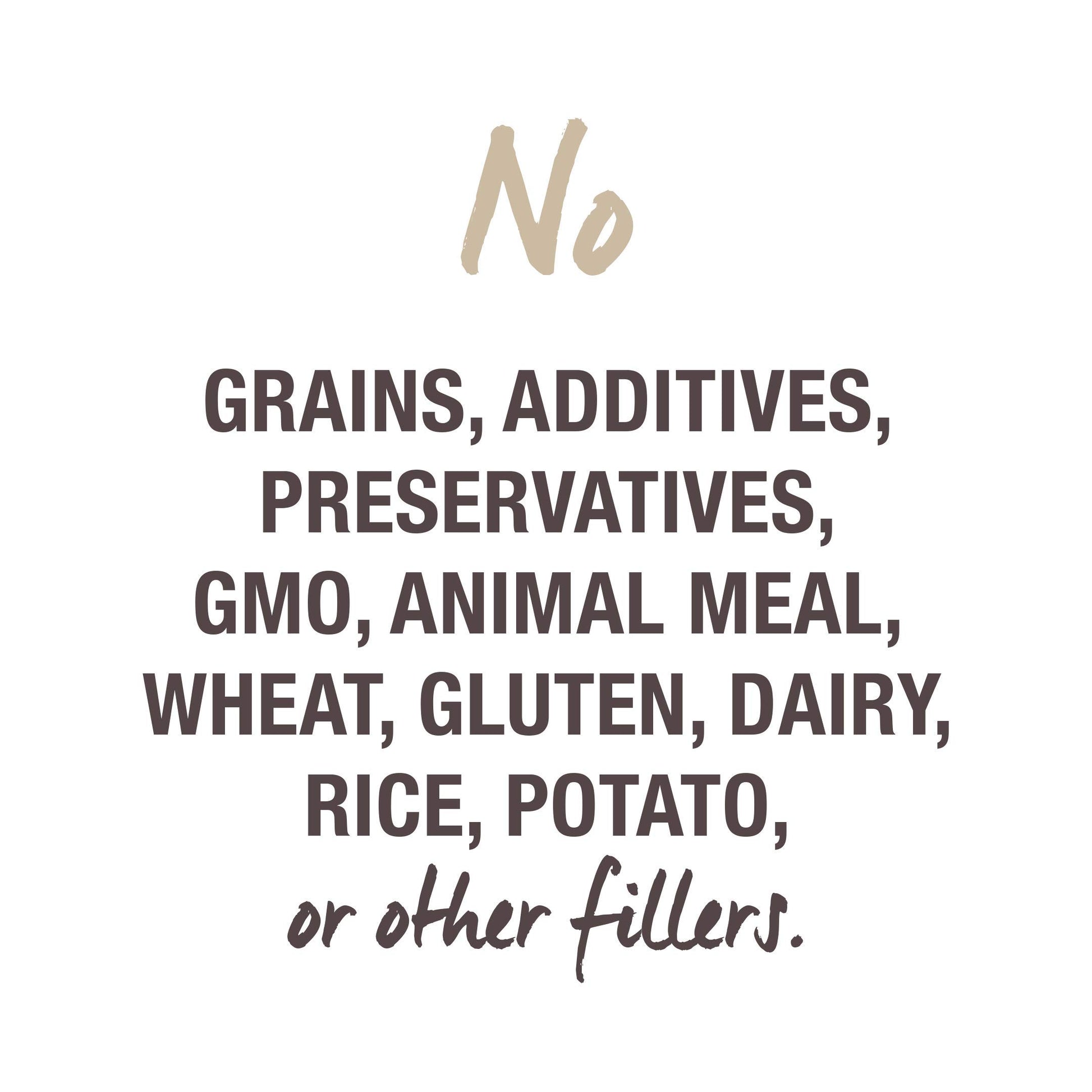 - Made without grain, wheat, gluten, GMO, ingredients, corn, soy, cereals, dairy, dairy, rice, potato and all other fillers
