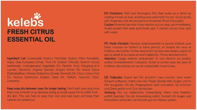 • Revive and Refresh: Our dog shampoo bar is a great way to revive and refresh your dog's coat. It contains invigorating citrus oil that leaves your pet smelling great all day. This is the best dog body wash shampoo for pets that need a deep clean.