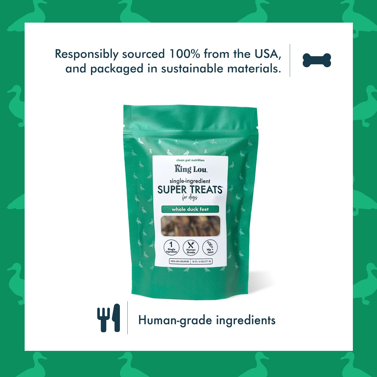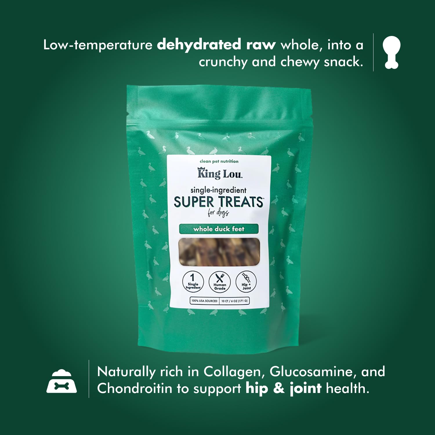 King Lou Pets - Whole Duck Feet for Dogs - Dehydrated Duck Dog Treats - USA-Made Dental Treats for Dogs - Collagen, Glucosamine, Chondroitin for Hip and Joint Health - 10 Count