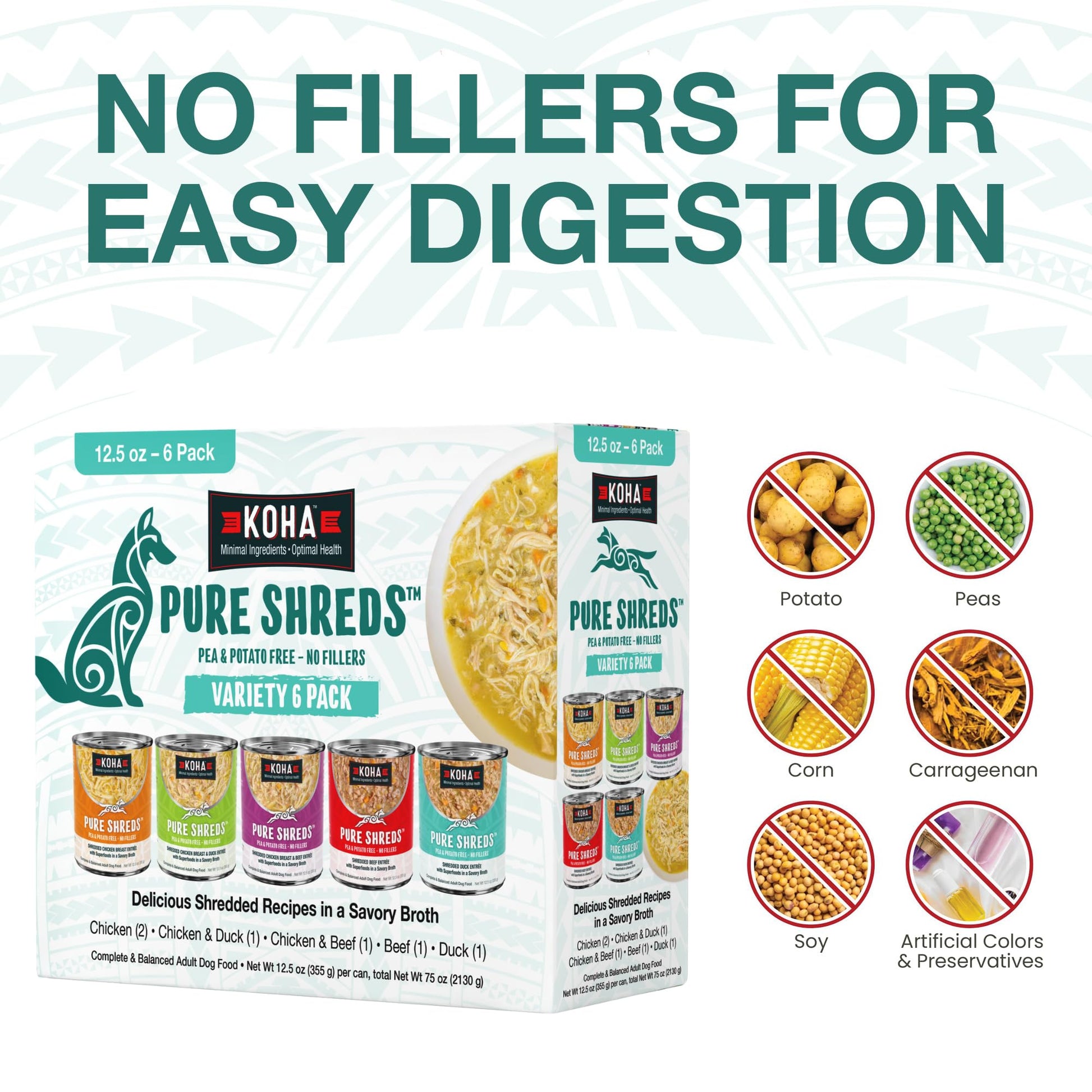 KOHA Pure Shreds Dog Variety Pack, High Protein Wet Dog Food- 5 Flavors - Beef, Duck, Chicken & Duck and Chicken & Beef Food for Dogs - 12.5oz Cans, Pack of 6