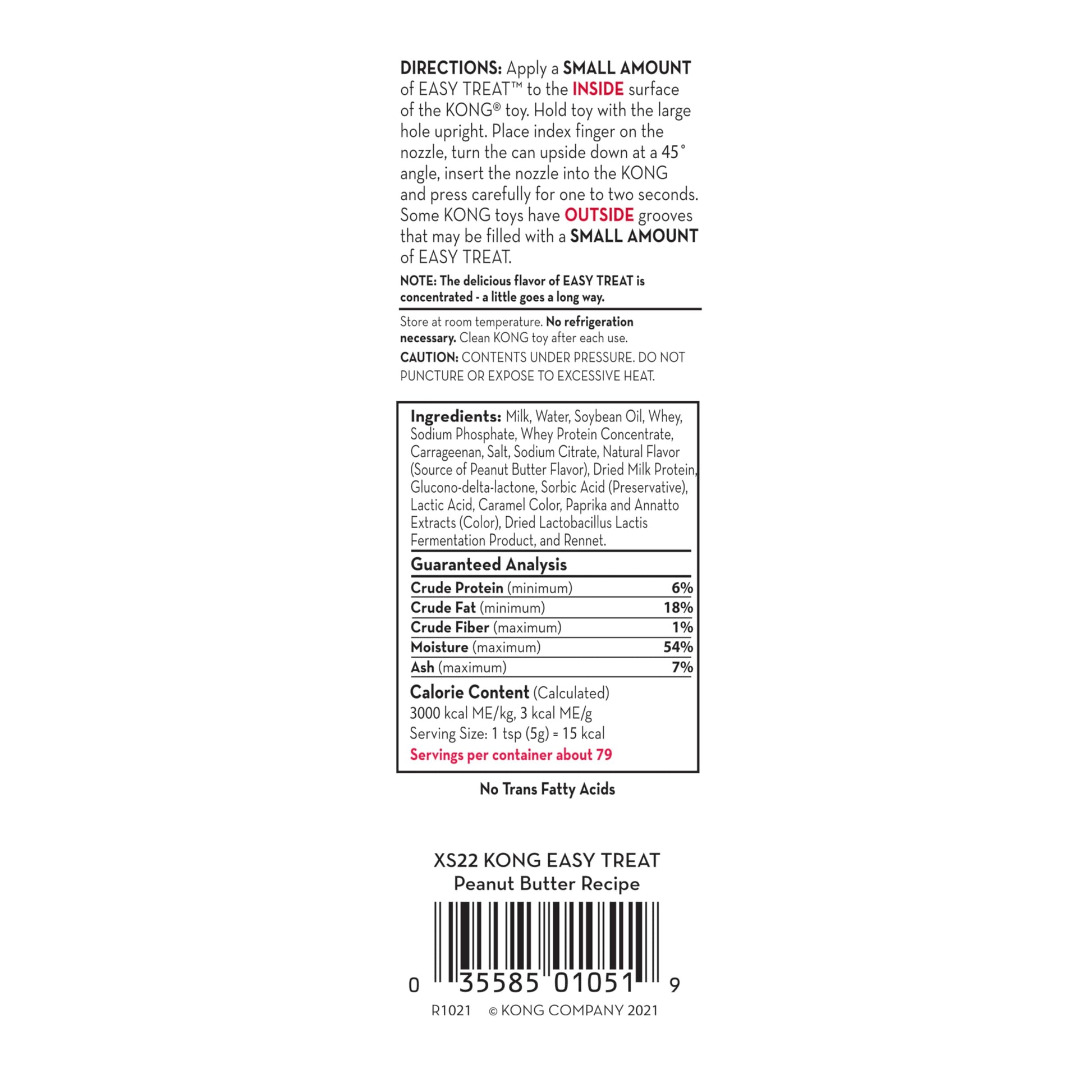 Details: The KONG Classic is the epitome of dog toys, a staple in the pet supply world for over four decades. This classic red rubber toy has been designed with your pet's instinctual needs in mind, providing an ultra-durable solution for dogs who enjoy chewing and playing. This product is perfect for heavy chewers like your beloved German Shepherd or Labrador, or lighter chewers just looking for an enrichment toy.The Easy Treat is a dog peanut butter spray that is simple and mess-free to use. The specially designed nozzle allows for easy control of the amount of treat dispensed, making it an ideal solution for stuffing KONG toys. For a longer-lasting, mind-occupying challenge, try freezing a stuffed KONG filled with the Peanut Butter Easy Treat!The KONG toy isn't just a chew toy; it's an engaging, mentally stimulating addition to your dog accessories. Its unique design and unpredictable bounce keep your pup engaged and entertained. It's perfect for a game of fetch, allowing your pet to get the exercise they need while satisfying their need for play.The KONG Classic is more than a toy; it's an enrichment tool that meets the needs of dogs, providing them with the mental and physical stimulation they crave. One of the standout features of the KONG Classic is its treat-filling capability. The hollow interior of the toy can be filled with bits of kibble, a dash of peanut butter, or KONG Easy Treat, Snacks, or Ziggies. This feature not only makes the toy more enticing for your dog, but it also presents an added challenge.Having a dog or puppy is a joy, and playing with them is so much fun. We believe dogs need to play. That's why KONG has worked since 1976 to bring you and your pet the most innovative and safe toys made from the finest materials that will last. From obsessive attention to detail and a relentless pursuit of education, we are dedicated to giving pet parents a way to connect with their dogs.