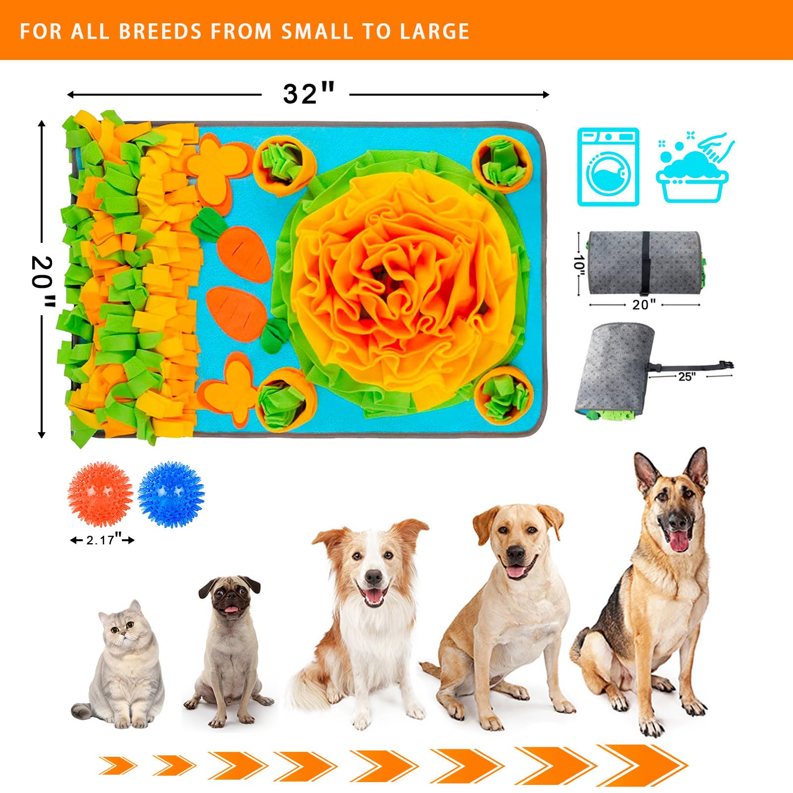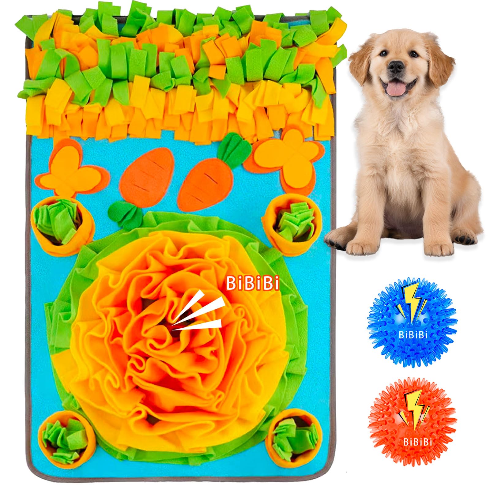 Details: **Unleash Your Pet’s Natural Genius with the Ultimate Snuffle Mat!** Give your furry friend the mental workout they crave! Our premium snuffle mat transforms mealtime into a thrilling treasure hunt. The intricate petal design hides treats deep within its layers, while the **squeaky center** sparks curiosity—simulating wild foraging and reducing anxiety. For pets prone to gulping food, it doubles as a **slow feeder mat** to aid digestion and prevent vomiting. **Why Pet Owners Love It:** 1、All-in-One Enrichment: Combines **sniffing**, **licking**, and **chewing** (thanks to the bonus spike balls) for holistic stimulation. 2、Built to Last:Heavy-duty polyester base resists sliding, even on hardwood floors. 3、Hassle-Free Maintenance:Toss it in the washer after messy meals—no fading or fraying! **Specs:** - Material: Eco-friendly fleece (BPA-free, non-toxic) - Includes: 1 mat + 2 Spikey Balls - Care: Machine wash cold, air dry - Size: 32” x 20” (fits small dogs, large breeds, cats, and rabbits) **🌈 Perfect For:** - Puppies learning food puzzles - Senior dogs needing low-energy play - Anxious pets during storms/fireworks - Multi-pet households **⚠️ Safety Note:** Supervise pets during initial use. Not for aggressive chewers.