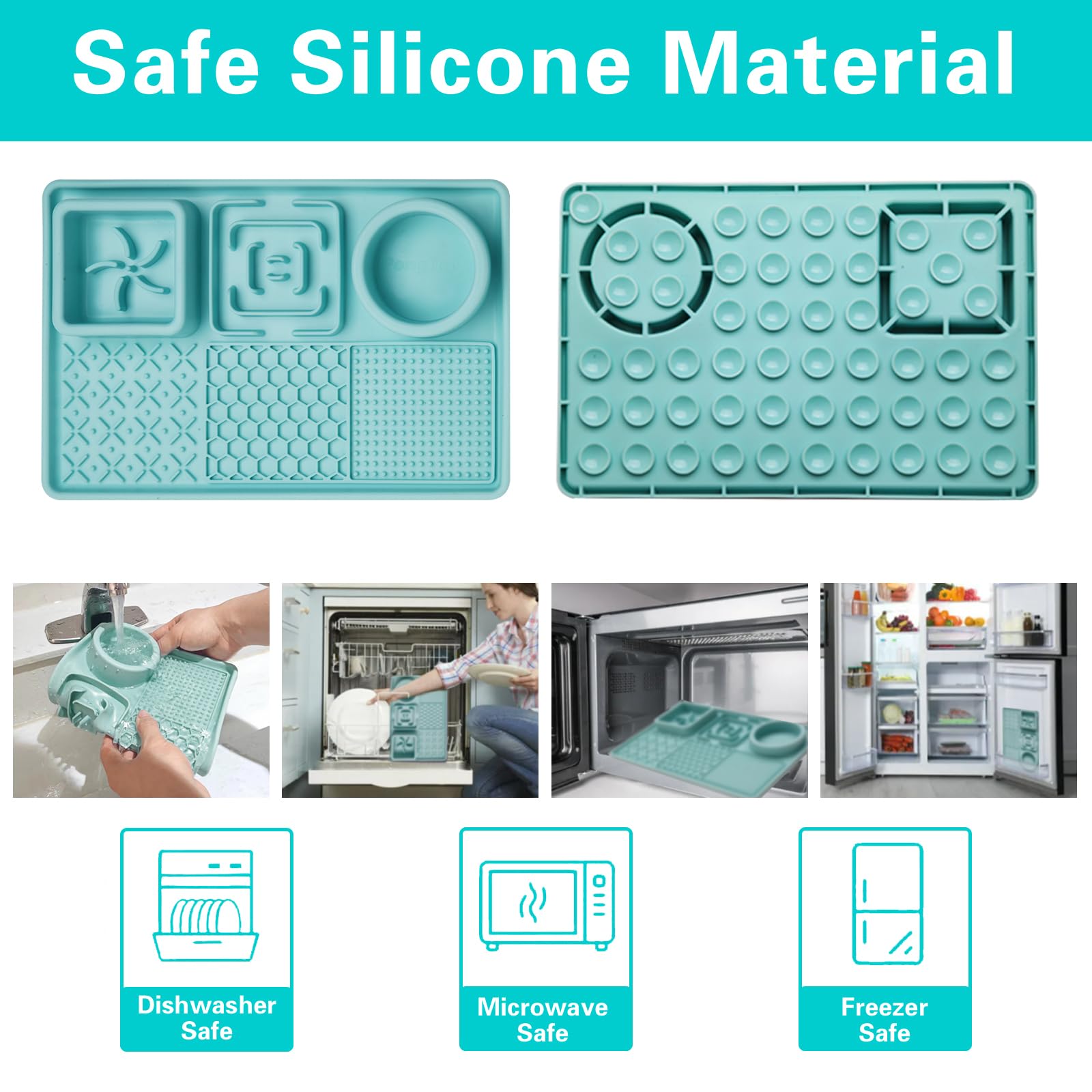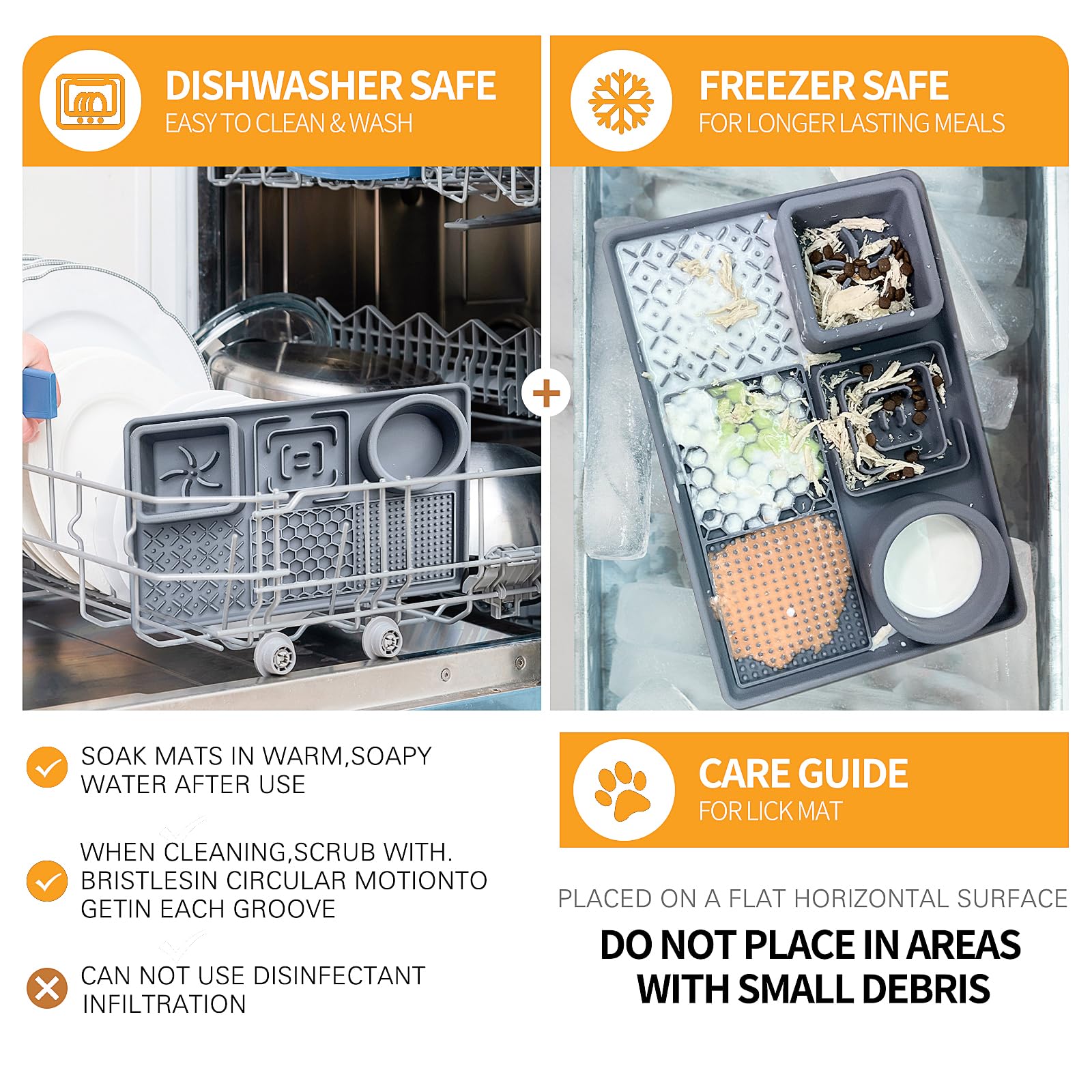 • 6-Quadrant Design:This dog lick mat designed with 6 different feeding areas, suitable for different pet foods. Designed with a water bowl, two slow food areas to put solid food such as dog food, snacks, beef jerky and three licking areas with textured surfaces, can be applied with different liquid foods, such as yogurt, peanut butter, etc. This dog feeding mat is a great dining accessory for multi-pet households