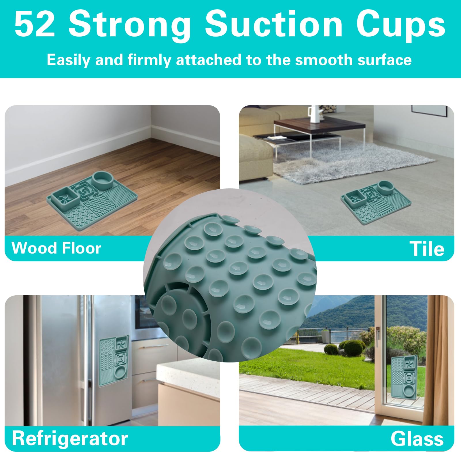 • Anti-slip Design: The pet licking mat has a non-slip design with 52 suction cups on the bottom, which provides a strong grip on the floor and prevent the dog mat from moving during feeding. Can be used on any smooth surface like the wood floor / glass or refrigerator