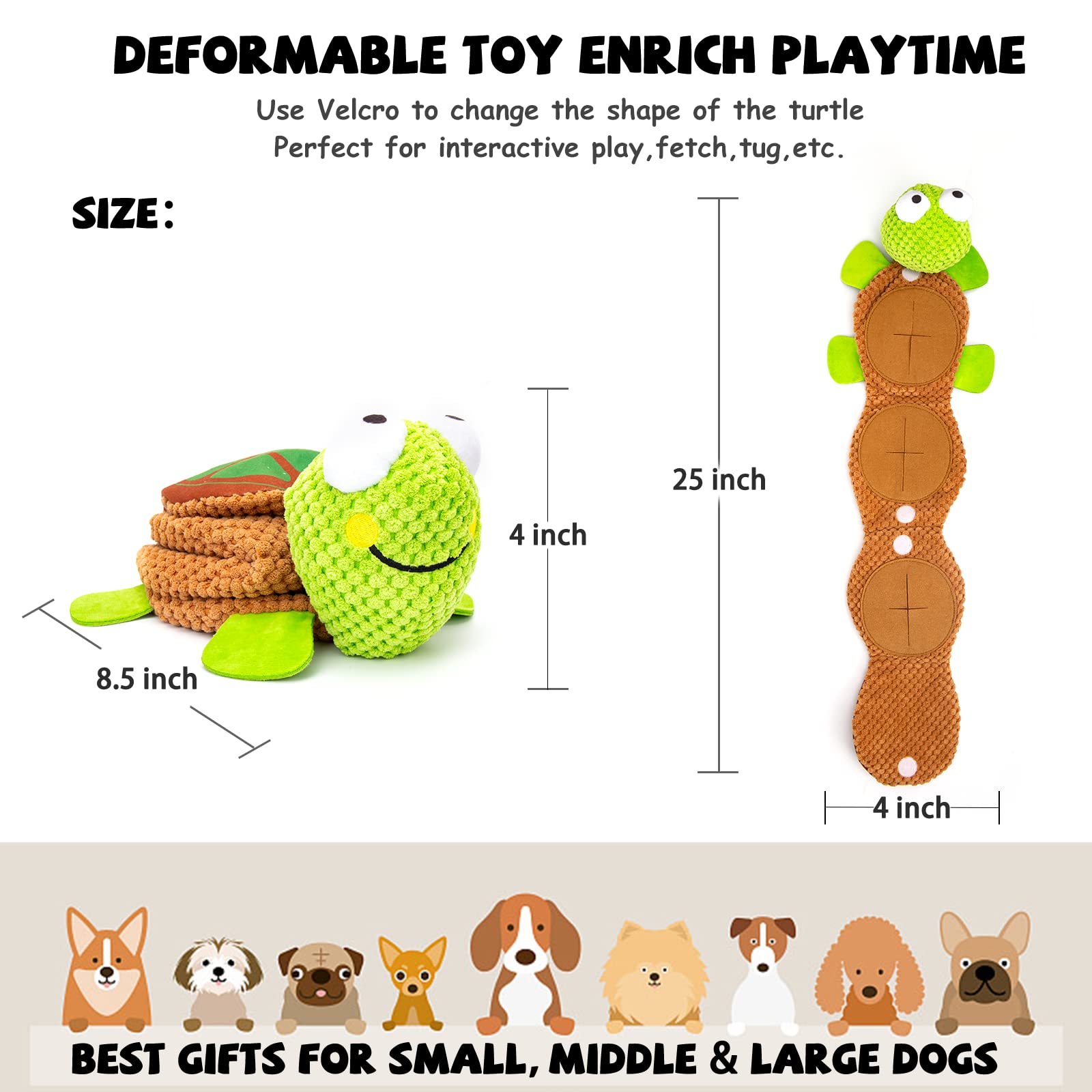 • Adjustable Long Dog Toy: Untie the velcro,cute squeaky turtle toy will become 25" long snake toy,perfect interactive toy for dogs to play tug of war, twirl or thrown. Long design allows you to grip one side while your pup bites down on the other, keeping your hands safe from that powerful bite!
