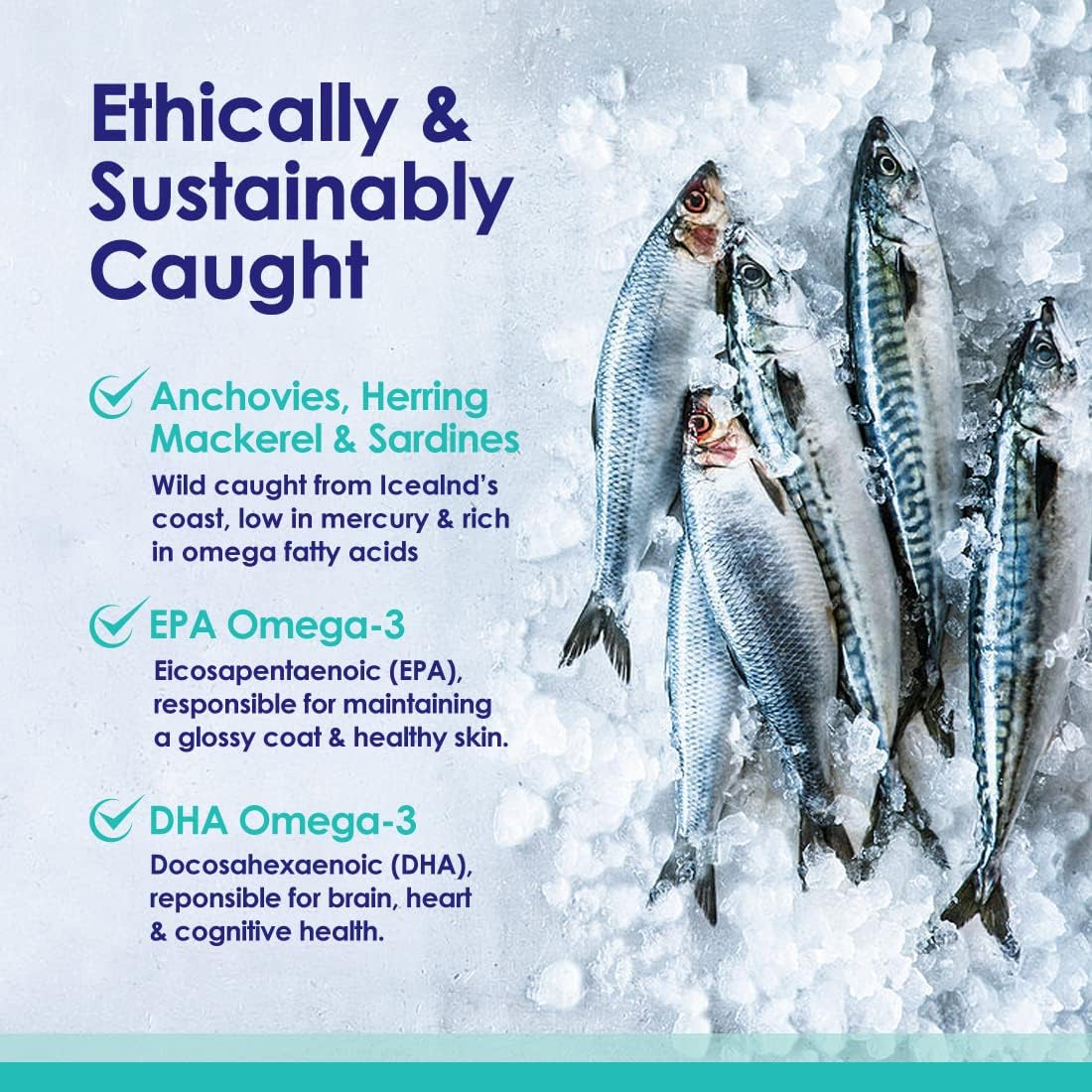 - 100% safe and all natural - Our premium liquid fish oil for dogs is made from wild caught sardine, herring, mackerel & anchovy from the crystal clean waters of Iceland using sustainable and responsible fishing methods safe for dolphins and other protected species. Our fish oil liquid for dogs contains no rosemary extract, additives or preservatives that could potentially harm your dog. Just the purest, most potent omega 3 oil for dogs on the market, ready to help improve your pet's health.