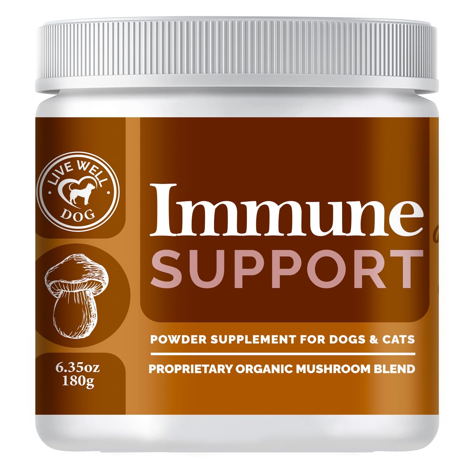 Details: Boost your furry friend's immune system with this all-natural powder supplement from Live Well Dog. Packed with a proprietary organic mushroom blend, this supplement provides essential nutrients like Reishi Organic, Turkey Tail, and Chaga to support your pet's overall health and well-being. With ingredients like chicken liver powder, sea buckthorn, and vitamin C, this formula is designed to strengthen your dog or cat's defenses. Easy to incorporate into their daily meals, simply mix the recommended dosage based on your pet's weight into their preferred food. This supplement contains no artificial flavors, preservatives, and is 100% natural, ensuring your beloved companion receives only the best. Keep your furry family member feeling their best with Live Well Dog's Immune Support powder supplement.