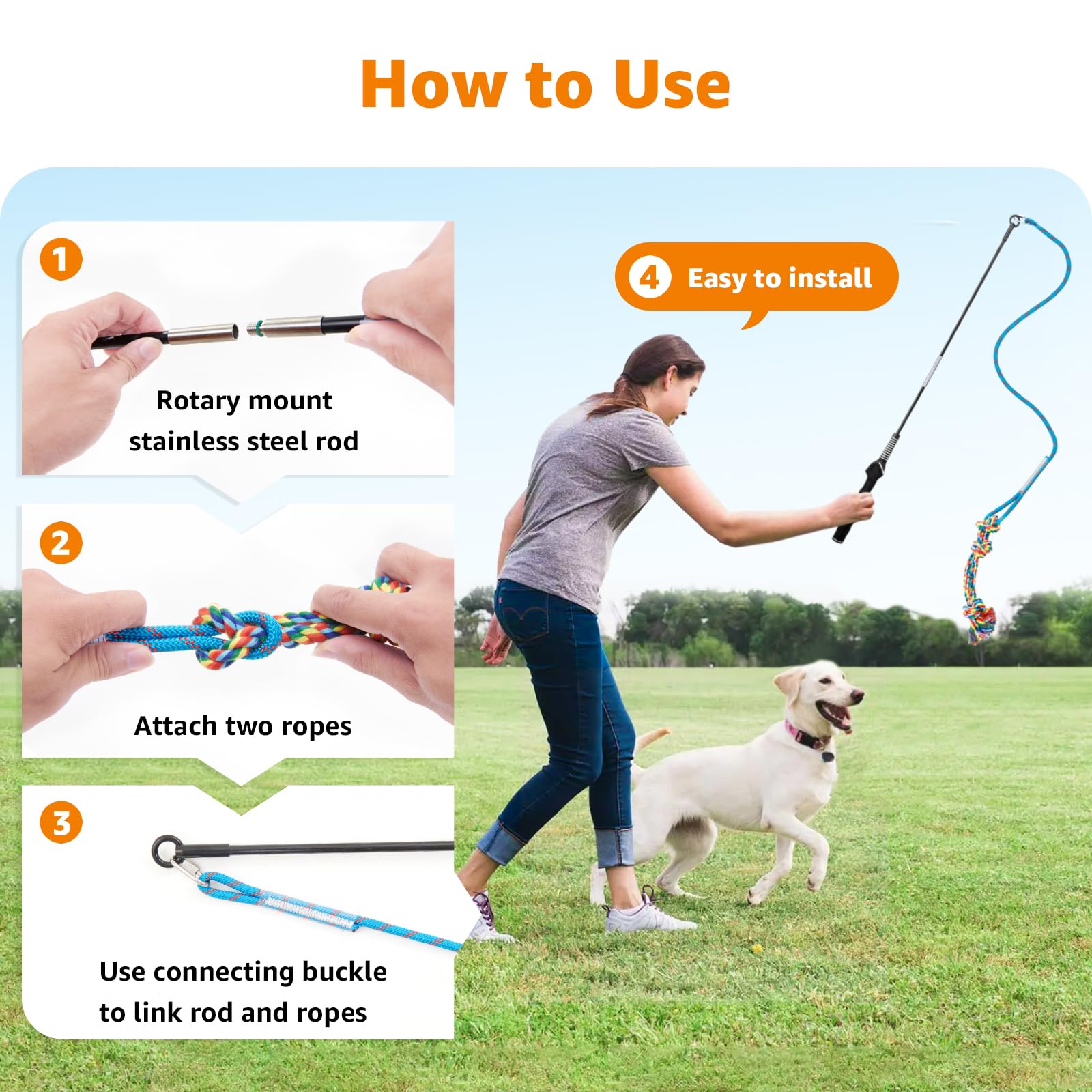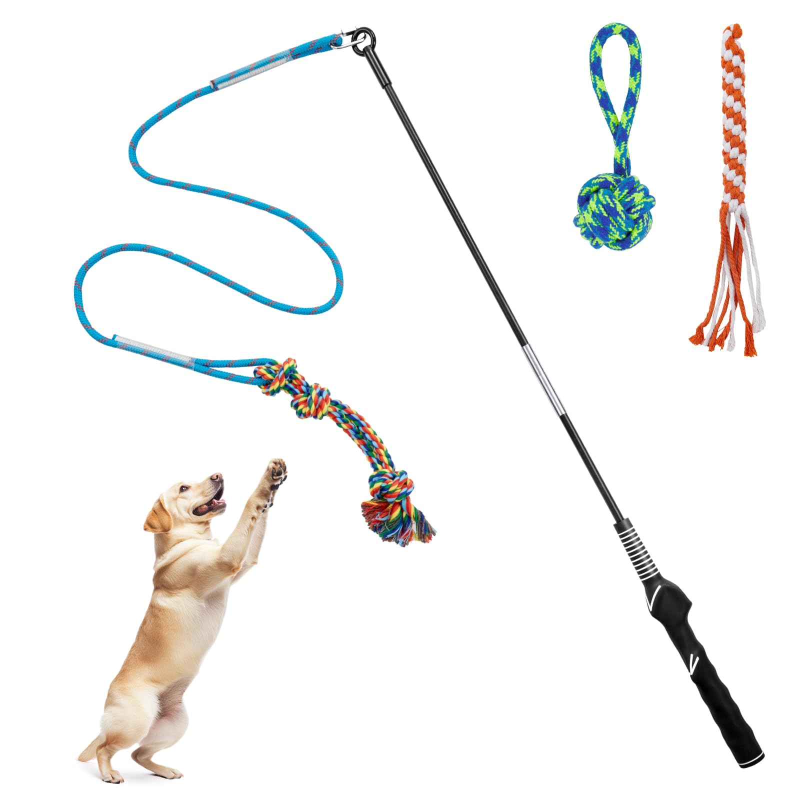 • 【Fits All Dog Sizes】- With a 33" handle, 39" cord, and three colorful rope toys, this flirt pole keeps you at a safe distance while your dog runs, chases, and tugs. It's a fantastic way for your dog to get a full workout and have fun at the same time