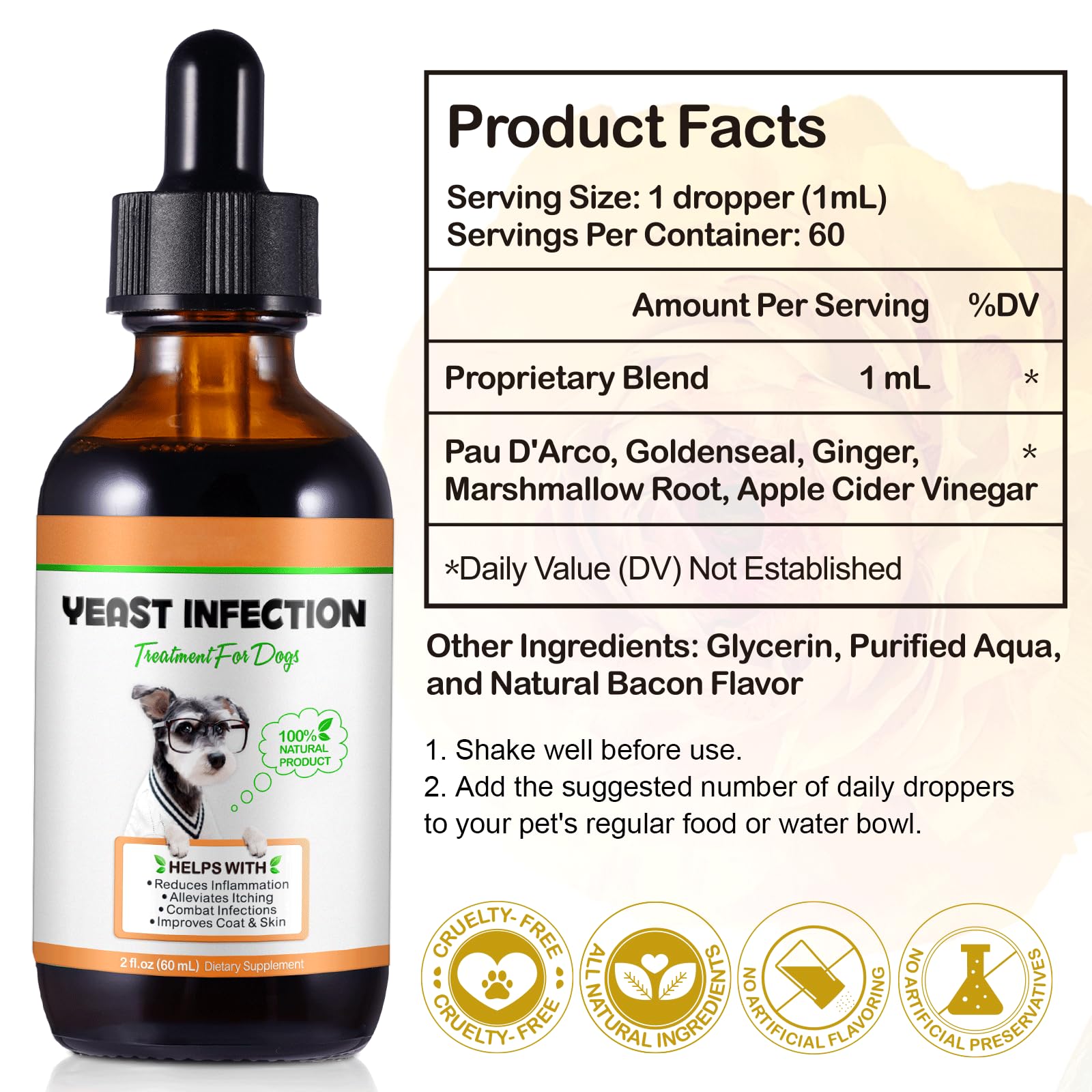 Perfect for all breeds and sizes, the treatment features a convenient dropper, ensuring precise application. You can easily mix it into your dog's food or water, and with its irresistible bacon flavor, your pet will love every dose. Designed for even the most sensitive skin, this dog yeast treatment ensures your furry companion feels healthier and happier with every use.