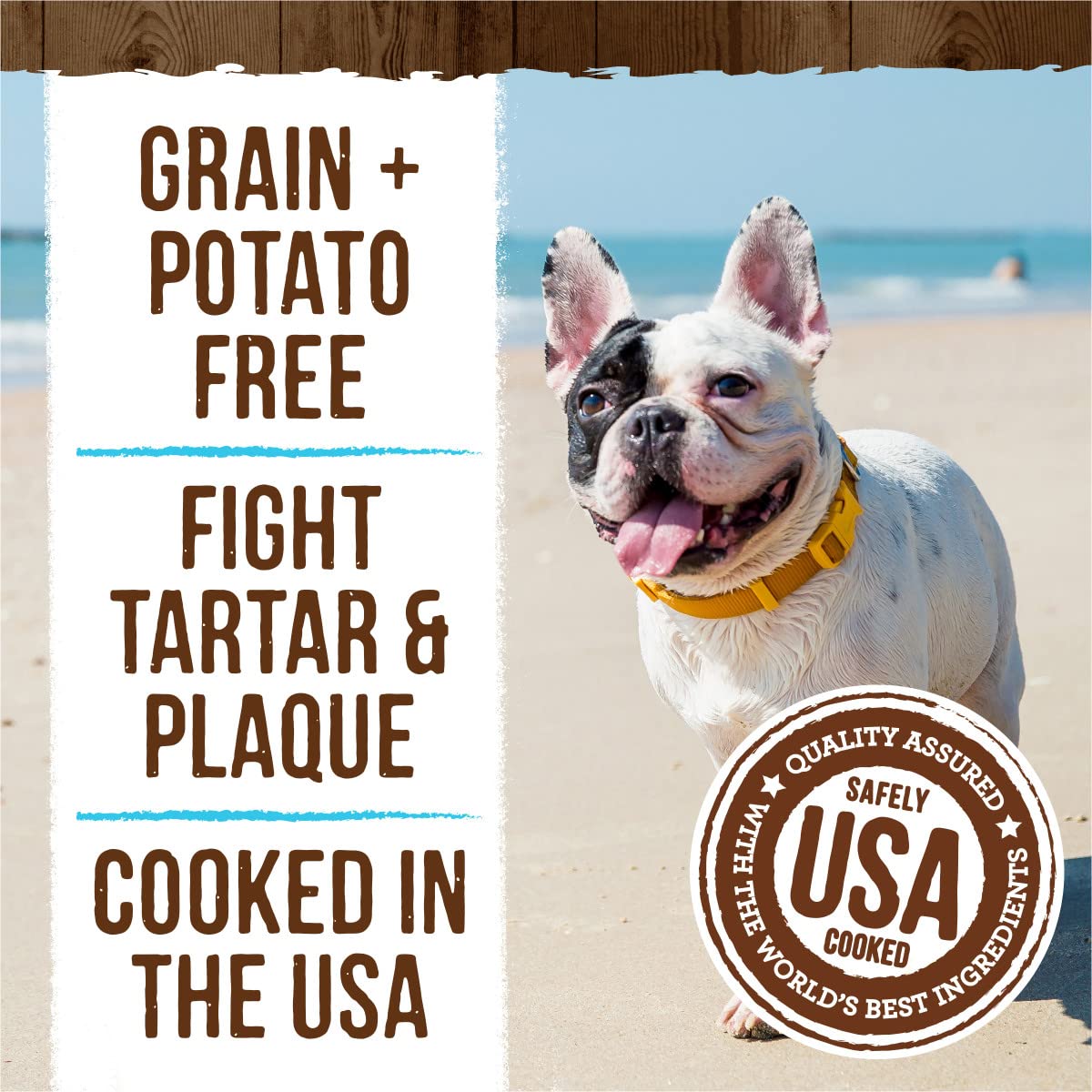 - Grain free dog treats are potato free. Cooked in the USA, these mint dog chews for small dogs weighing 15 to 25 pounds fight plaque and tarter