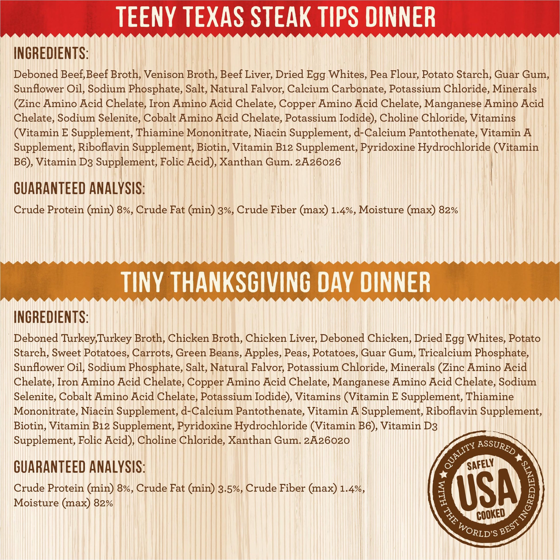 - Merrick Lil’ Plates Grain Free Dinner Duos Variety Pack, Tiny Thanksgiving Day Dinner And Teeny Texas Steak Tips Dinner In Gravy, Natural With Added Vitamins And Minerals Wet Dog Food For Small Dogs