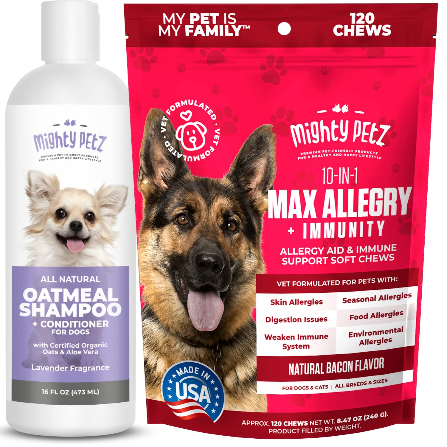 Details: Mighty Petz 2-in-1 Oatmeal Dog Shampoo and Conditioner – Dog Shampoo Sensitive Skin for Dog's Itchy Dry Skin with Soothing Aloe Vera + Baking Soda + pH balanced. Get Smelly Dogs Coat Fresh, 16 oz + Mighty Petz MAX Dog Allergy Relief - Itch Free Skin - Immune Supplement with Omega 3 Fish Oil + Probiotics + Colostrum. Skin & Coat Health + Digestion. 120 Chews for Pets with Seasonal Allergies
