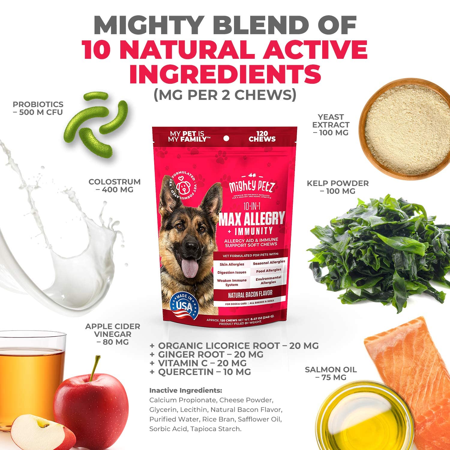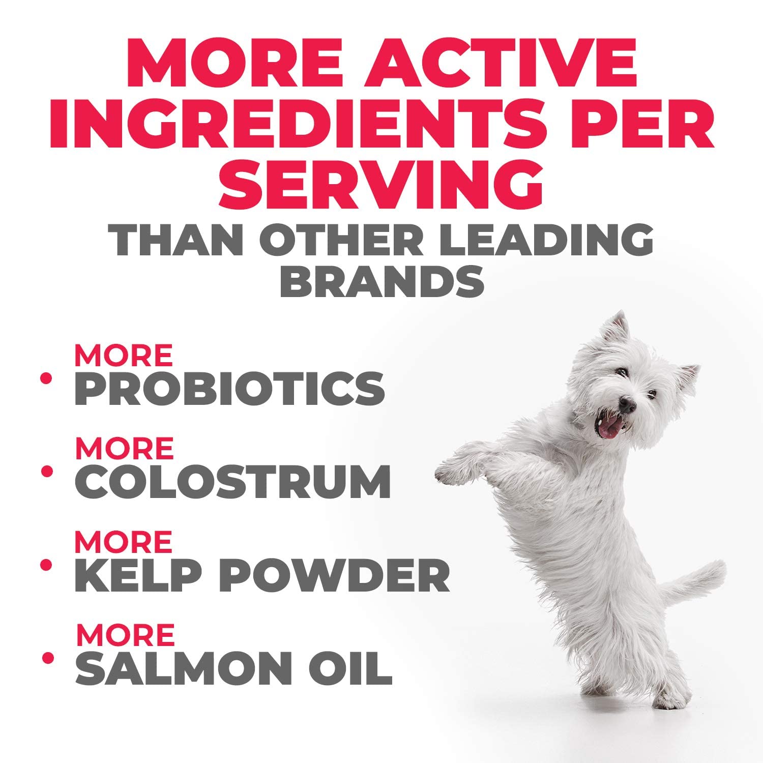 MAX Concentration for MAX Immune System Support - More Colostrum, Probiotics, Fish Oil & Quercetin per chew than other brands. Mighty formula with 10 active ingredients to support pets with seasonal skin & coat and occasional environmental allergies.
