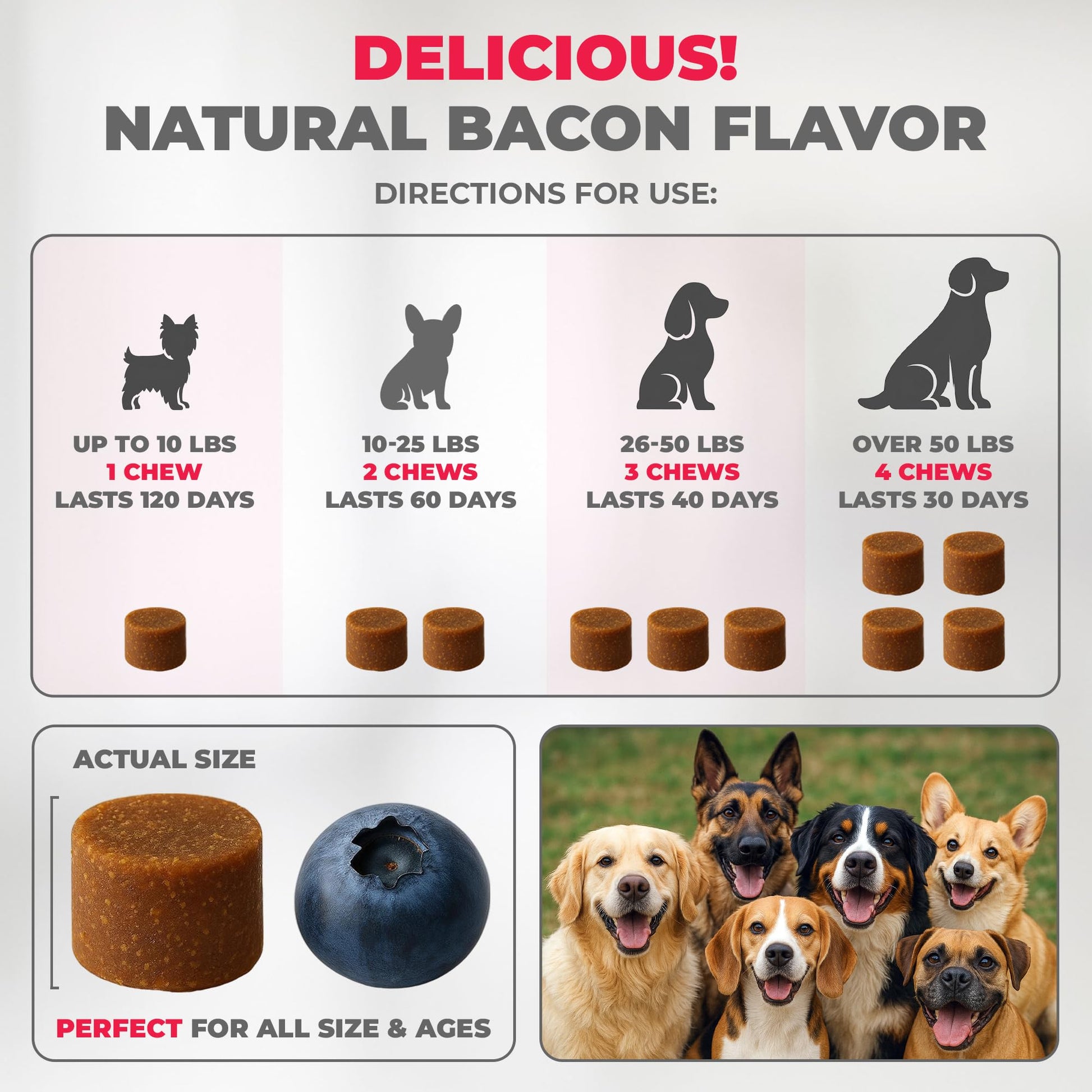 • Soft Chews with Natural Bacon Flavor Dogs Love: Bacon-flavored and soft-textured, ideal for picky eaters. Suitable for all ages and sizes, with an easy, weight-based daily dosage for consistent support