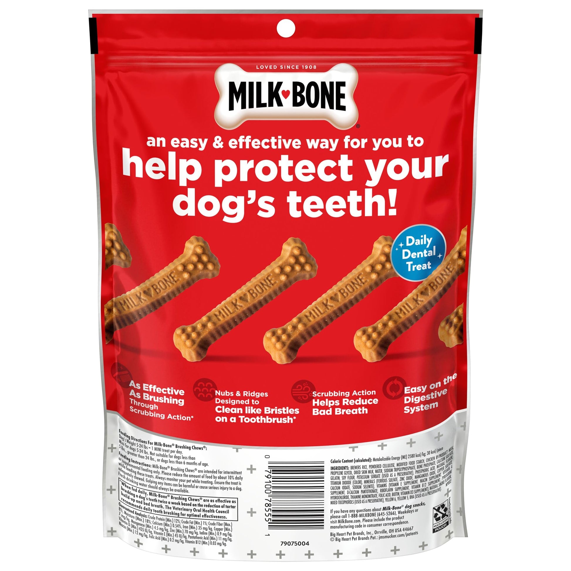 Details: If you love getting up close and personal with your dog, you can help freshen their breath with Milk-Bone Brushing Chews Daily Dental Dog Treats. While your canine companion enjoys these delicious dog chews, the scrubbing action helps clean their teeth and reduce bad breath. The twist design helps reduce tartar buildup, while the nubs and ridges help maintain healthy gums. These dog dental treats are also formulated with calcium to help support strong bones and teeth, and they have a tasty chicken flavor your dog will love. Plus, they contain no fillers or artificial flavors and are easy to digest. Stock up now for an easy and effective way to help protect your dog’s teeth.