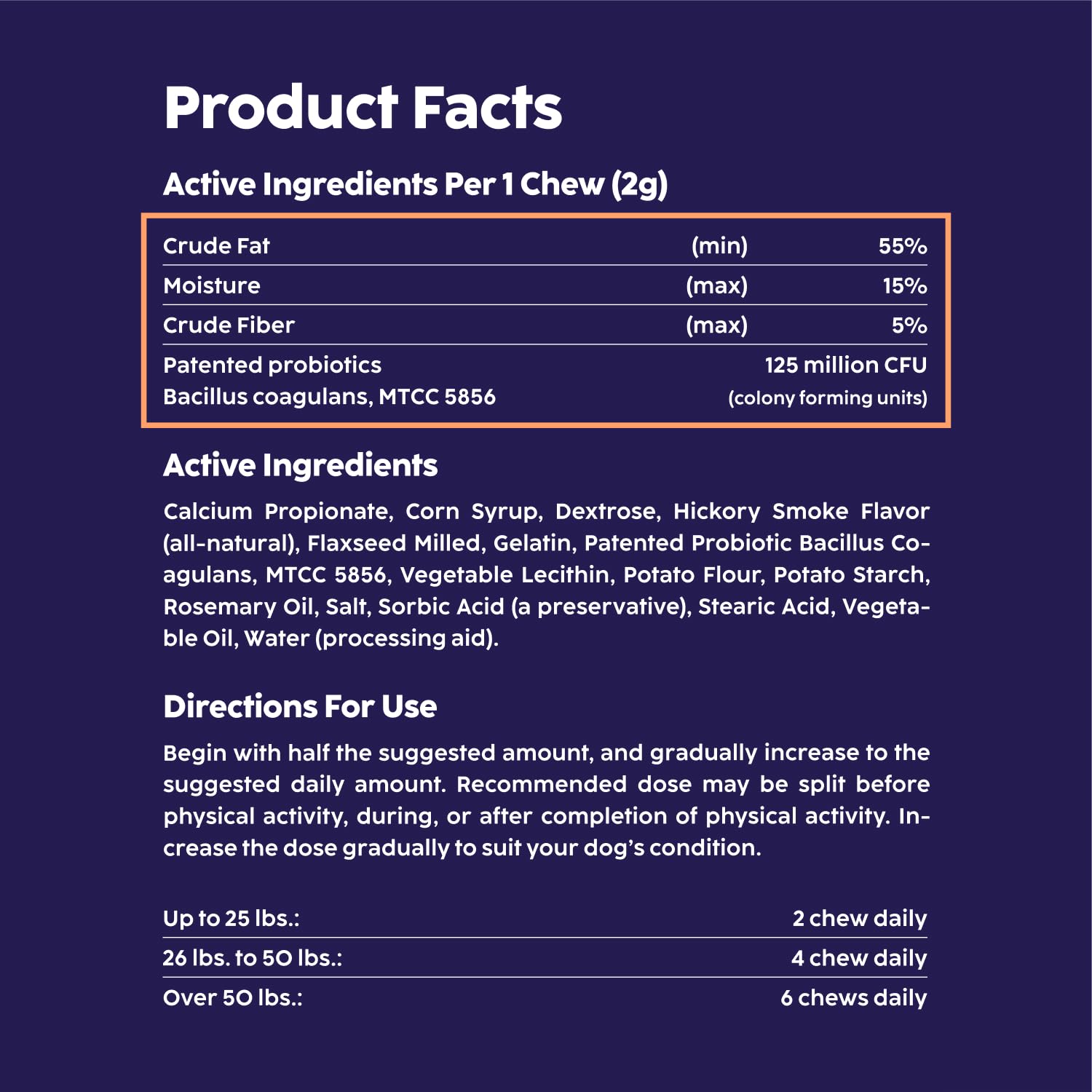 - Probiotics for gut health - 250 million CFUs are beneficial bacteria that support your dog's digestive system, enhancing nutrient absorption and overall gut health, reduced bloating, and firmer stools. A healthy gut can boost your dog’s immune system, helping them fight off infections and allergies more effectively.