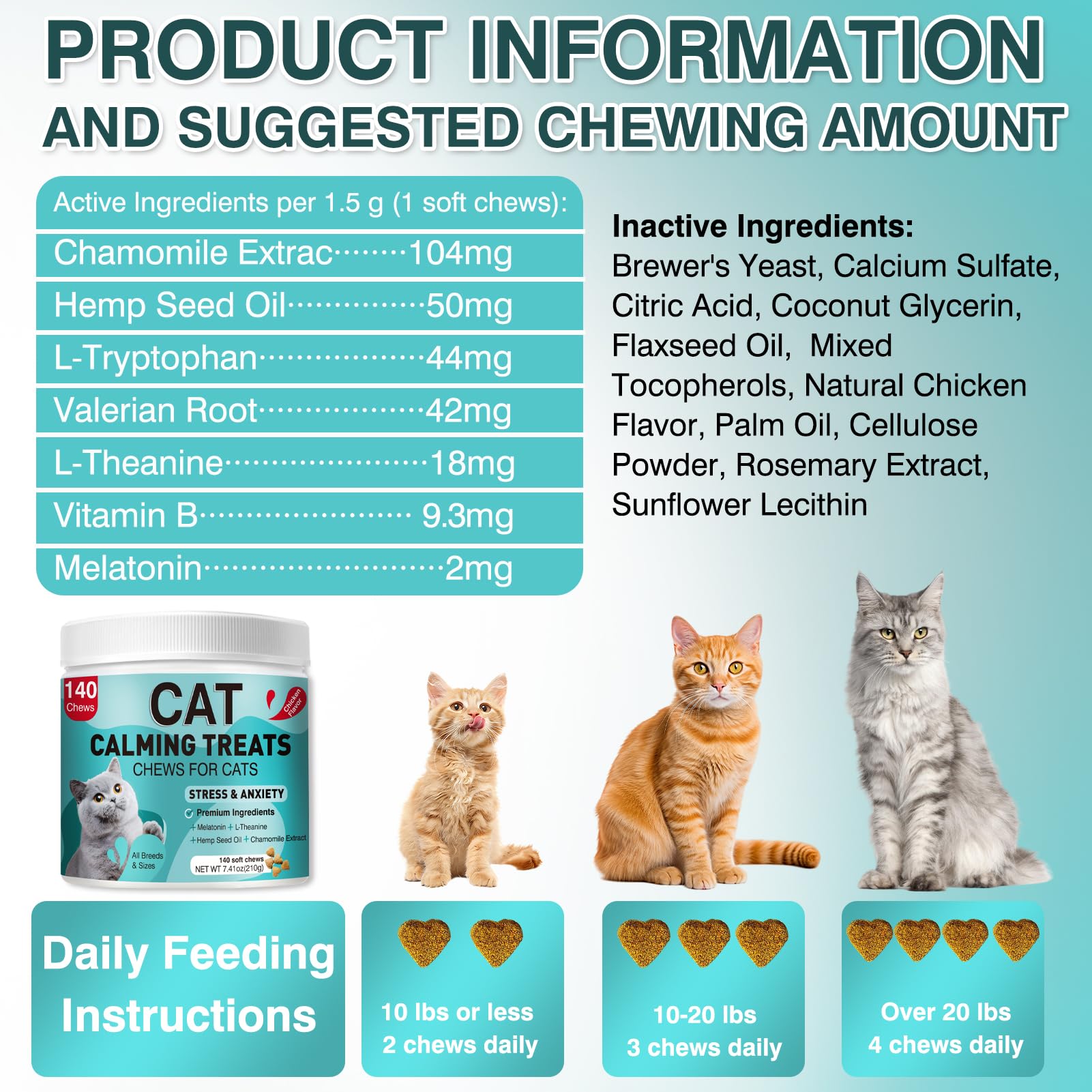• Bigger Particles, Long-Lasting Value: Each calming cat chews is 1.5g, larger than standard cat calming treats, ensuring your cat gets the full benefits. Meanwhile, soft chews are also very easy to consume. With 140 pieces cat calming chews per bottle (210g total), calming treats for cats offer long-term emotional balance and mental health support. Perfect for calming cat treats for anxiety and maintaining a serene environment for your furry friend