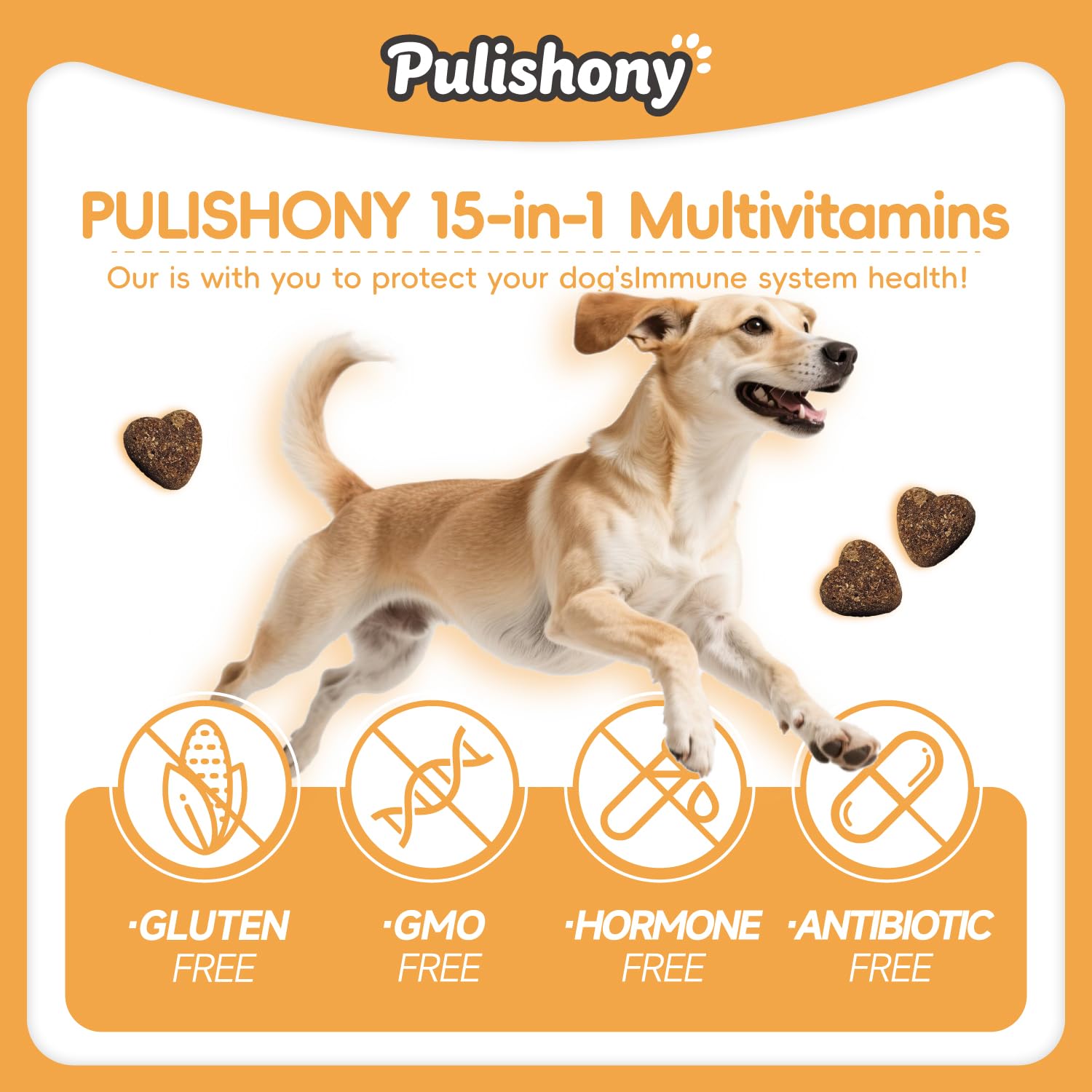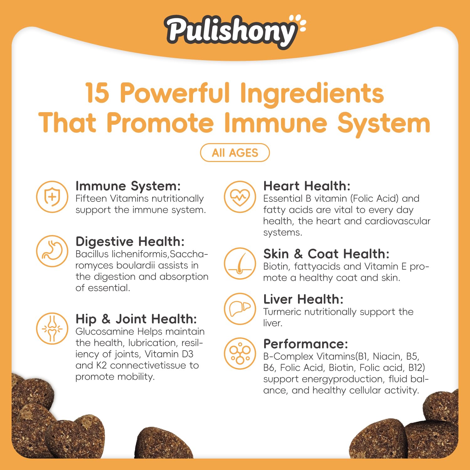 • 15-in-1 Formula - Pulishony Multifunctional Bites are Multivitamin functional Multivitaminsupplement chews with premium ingredients that support physical performance, antioxidants, hip & joint, heart, immune, skin, liver, & gut health for dogs of all ages, breeds, and sizes.