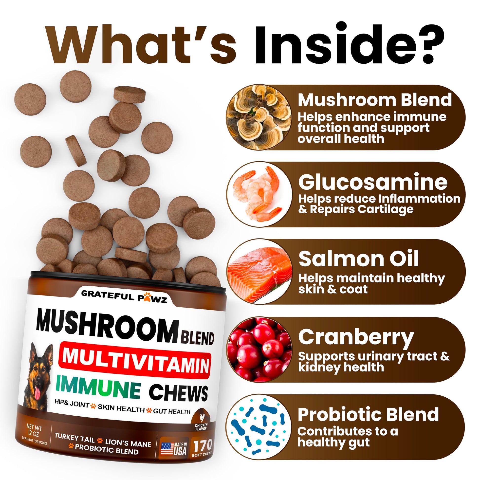 - 30-in-1 Mushroom Multivitamin: Made with 7 functional mushrooms, 6 probiotics, Omega-3 salmon oil, glucosamine, these chews support immunity, digestion, joint health and overall vitality for your dog.