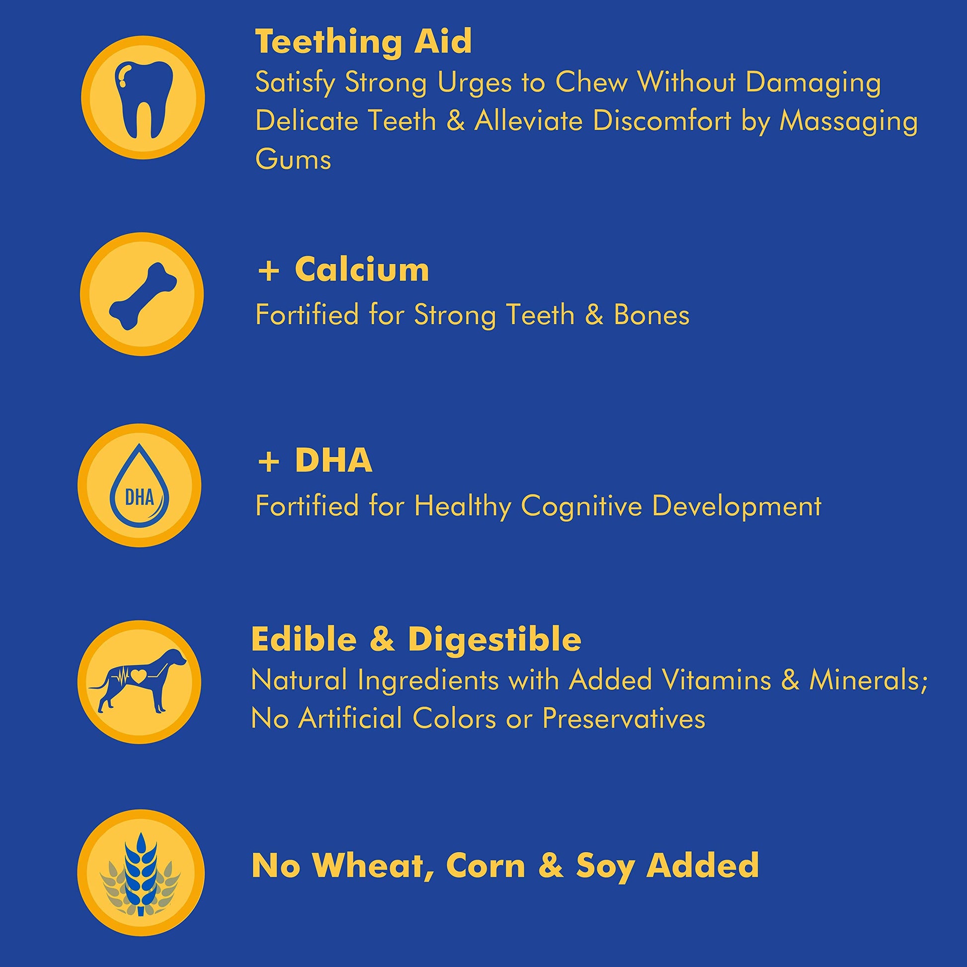 Details: Growing new teeth is tough work Sore gums and a strong urge to chew while cutting new teeth can turn your precious puppy into a whirlwind of destruction. N-Bone Puppy Teething Rings are easy for floppy puppy paws to hold onto and provide a soothing and appropriate outlet for chewing. Formulated with DHA and calcium to support your puppy’s unique nutritional needs, our delicious chicken flavored rings are pliable and won’t damage immature teeth.