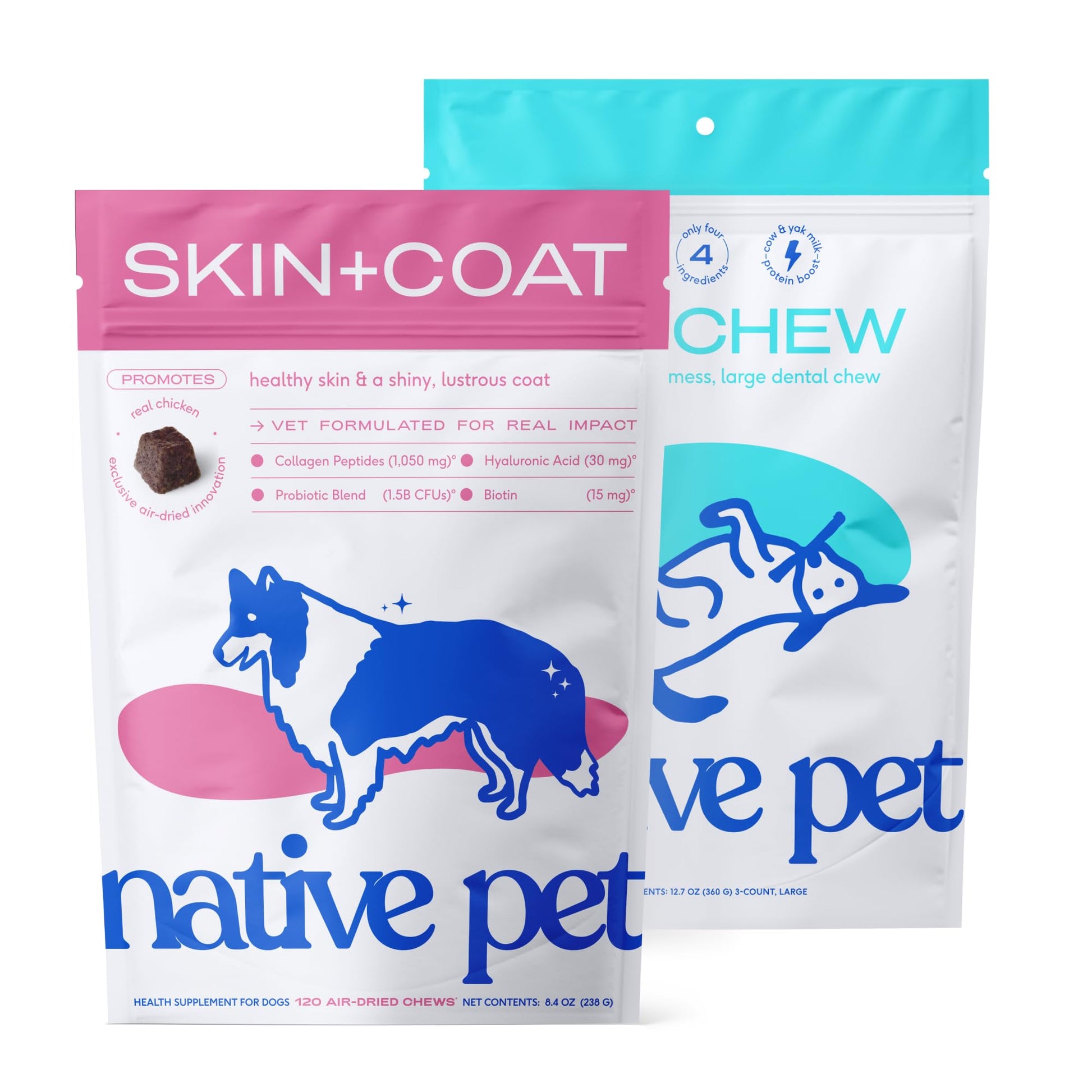 Native Pet Omega Skin and Coat Chews for Dogs (120 Air-Dried Chews) & Yak Chew (3 Large Chews) - All Natural Dental Sticks Made with Yak Cheese & Pure Omega 3 Fish Oil