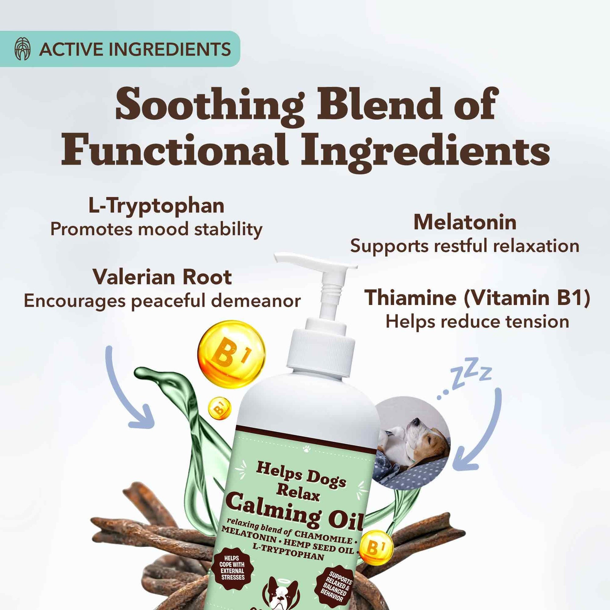 CALMING INGREDIENTS, PEACEFUL PET: Infused with Melatonin for dogs and Valerian Root, our calming oil is crafted using Chamomile, and Ginger Root. This potent blend synergistically soothes and relaxes your dog, effectively easing anxiety with natural herbs.