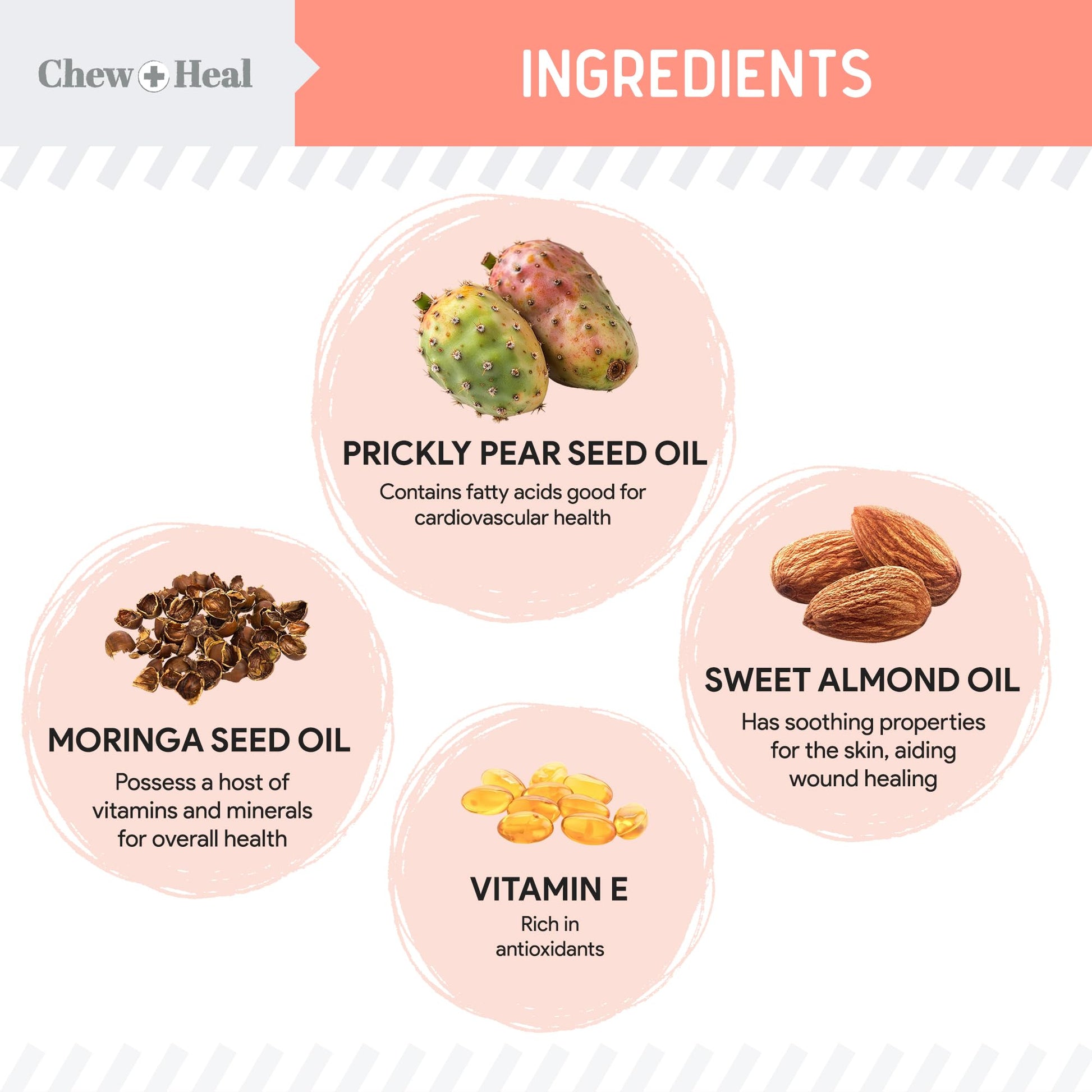 • Avocado and prickly pear seed oils naturally contain omega-3 and 6 fatty acids, which support skin hydration and coat health.