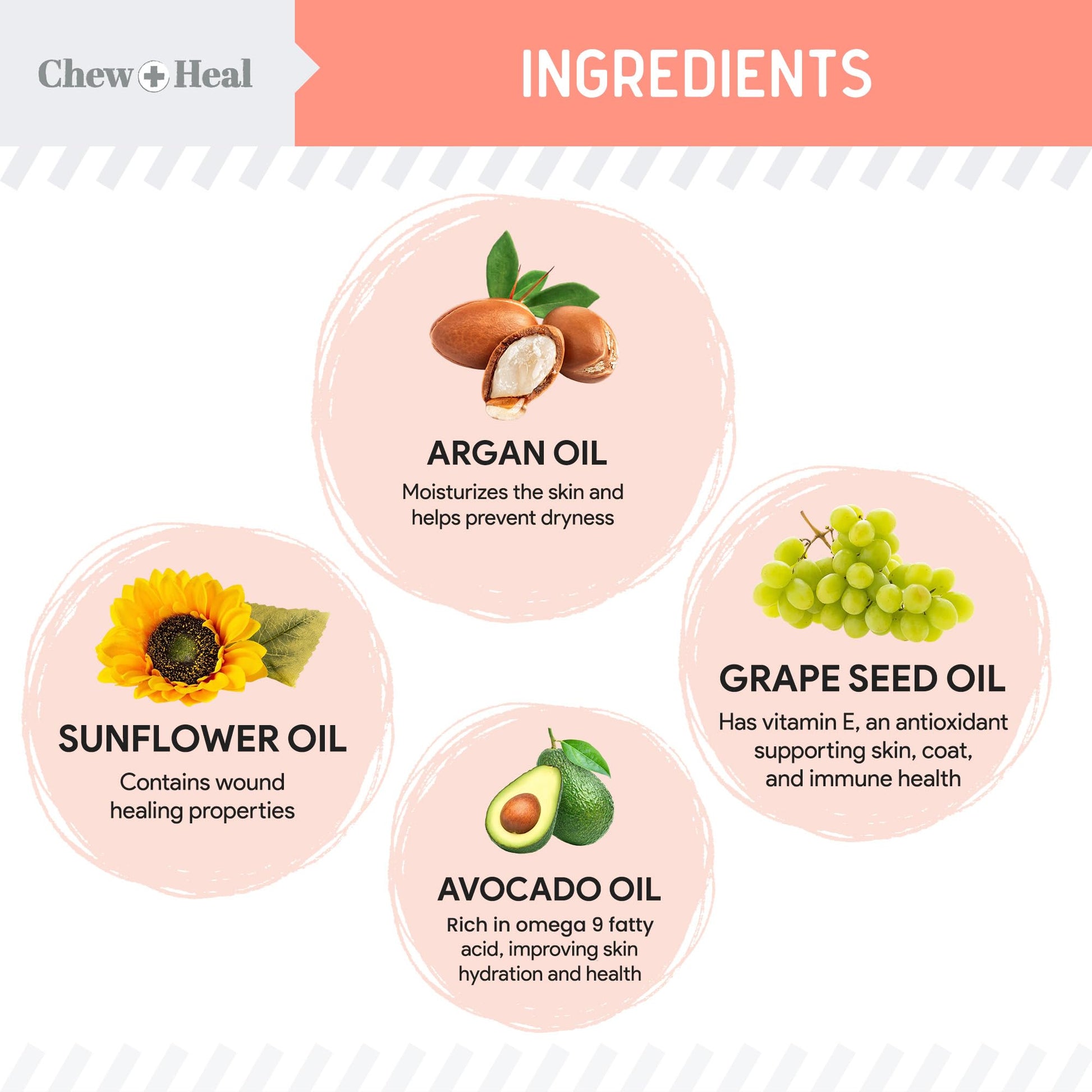 • Grape seed oil contains vitamin E, an antioxidant that can help with hot spots and itching as well as skin, coat, and immune health.