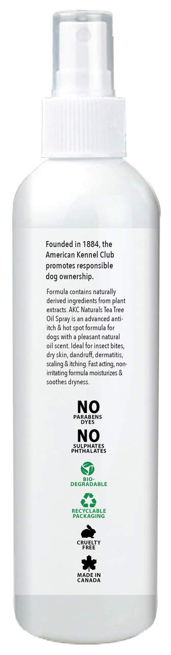 Details: Naturals Tea Tree and Chamomile infused anti-itch and hot spot formula are perfect for your dog's needs. The advanced formula moisturizes your dog's skin, coat and eliminates tangles. The Tea Tree Oil Spray is ideal for insect bites, dry skin, dandruff, scaling and itching. The product is made from plant extracts & is non-oily. Every bottle is fast acting, non-irritating and made without parabens, dyes, phthalates, and sulphates. Dilution of tea tree oil is 1% or less; tea tree oil should not be ingested.
