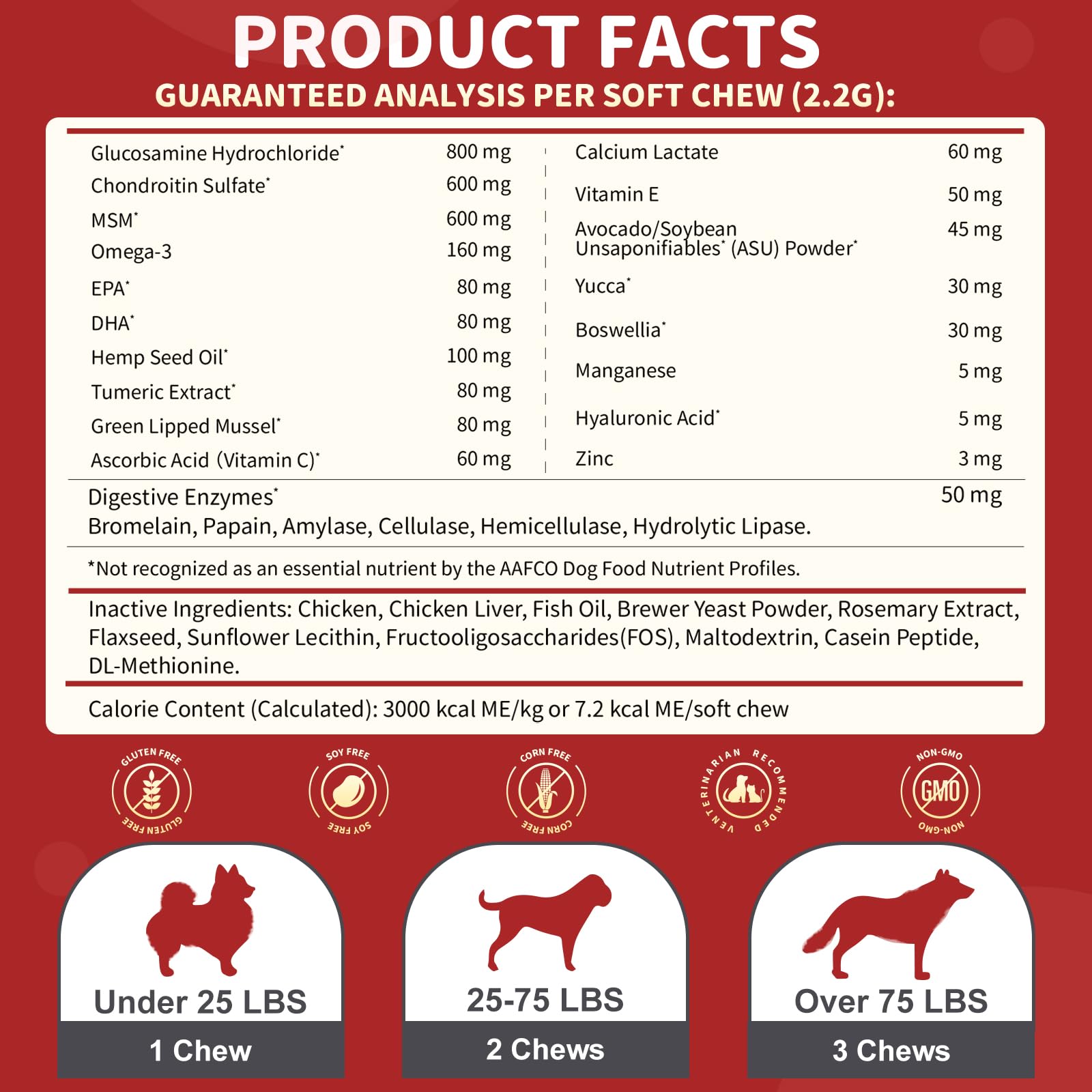 - QUALITY YOU CAN TRUST: Our delicious chicken flavored dog joint supplement large breed are formulated with high-quality ingredients and our facility is GMP (Good Manufacturing Practice) compliant to ensure your pet is receiving a safe supplement. No wheat, corn, soy, or artificial fillers, so you can rest assured you're giving your pet the best quality product possible! You can add it to furry babies' daily diet without worry, just give the chews directly or crumble it in food.